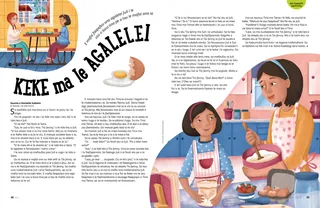 Sa o atu Tía Jenny ma Juli i le umukuka. Sa la faaaogaina taga o lima ma le faaSipaniolo faigofie e talanoa ai. Sa faaali atu e Tía Jenny ia Juli le auala e fai ai se keke sukalati-vanila. Sa fesoasoani Juli e fua le falaoamata ma le suka. Sa ia tipitipia foi strawberries e alu i luga. E le’i umi ae i ai le keke i le ogaumu. Sa manaia lona manogi mai!