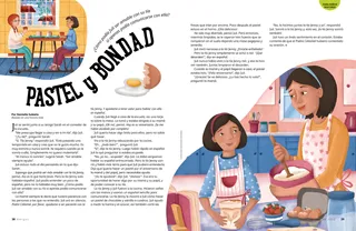 La tía Jenny y Juli fueron a la cocina. Hicieron señas con las manos y usaron un español sencillo para comunicarse. La tía Jenny le mostró a Juli cómo hacer un pastel de chocolate y vainilla a cuadros. Juli ayudó a medir la harina y el azúcar; así también cortó las fresas que irían por encima. Poco después el pastel estuvo en el horno. ¡Olía delicioso!