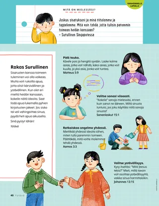 Sisarusten kanssa toimeen tuleminen voi olla vaikeaa. Mutta voit rukoilla apua, jotta olisit kärsivällinen ja ystävällinen. Kun olet eri mieltä heidän kanssaan, kokeile näitä ideoita. Saat lisää apua lukemalla pyhien kirjoitusten jakeet. Jos sisko tai veli vahingoittaa sinua, pyydä heti apua aikuiselta.