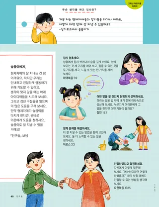 형제자매와 잘 지내는 건 참 어려워요. 하지만 우리는 인내하고 친절하게 행동하기 위해 기도할 수 있어요. 생각이 맞지 않을 때는 아래 아이디어들을 시도해 보세요. 그리고 경전 구절들을 읽으며 더 많은 도움을 구해 보세요. 만약 형제자매가 슬픔이를 다치게 한다면, 곧바로 어른에게 도움을 청하세요.