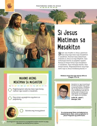 Bisan asa miadto si Jesus, giatiman niya ang mga tawo nga masakiton o nasakitan. Human Siya nabanhaw, mibisita si Jesus sa mga Nephite. Siya mihangyo kanila sa pagdala ngadto Kaniya ni bisan kinsa nga masakiton o nasakitan. Siya mihupay kanila. Siya miayo kanila. Mapasalamaton ang mga tawo nga si Jesus mitabang kanila.