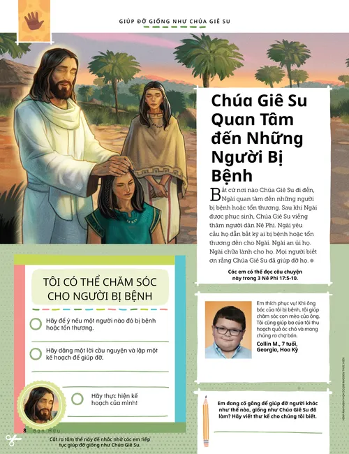 Bất cứ nơi nào Chúa Giê Su đi đến, Ngài quan tâm đến những người bị bệnh hoặc tổn thương. Sau khi Ngài được phục sinh, Chúa Giê Su viếng thăm người dân Nê Phi. Ngài yêu cầu họ dẫn bất kỳ ai bị bệnh hoặc tổn thương đến cho Ngài. Ngài an ủi họ. Ngài chữa lành cho họ. Mọi người biết ơn rằng Chúa Giê Su đã giúp đỡ họ.