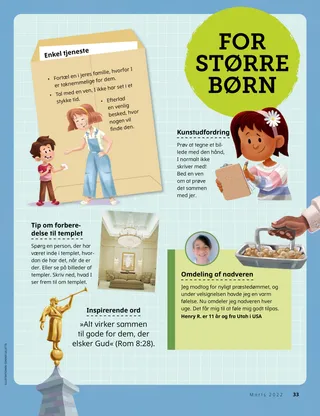 Marts 2022 Kære vennerLæs et budskab om at overvinde udfordringer. Mail-vennerLæs nogle breve fra vores venner rundt om i verden! Juliann DomanFind fredMolly savner sine ældre søskende, men hun finder fred med Åndens hjælp. Kom og følg mig Kom og følg mig AktiviteterBrug disse aktiviteter til at studere Kom og følg mig med jeres familie. Josef forbereder sig på hårde tiderLæs en historie om, hvordan Josef forberedte sig på hårde tider i Egypten. Kort med skriftens helteSaml på kort, og lær om vigtige personer fra Det Gamle Testamente. Denne måned: Josef og Shiphrah og Puah. Lav en kurv til babyen Moses!Lav en kurv som den Moses’ mor lagde ham i. Dieter F. UchtdorfHvordan ved vi, at vor himmelske Fader elsker os?Læs et budskab fra ældste Dieter F. Uchtdorf om vor himmelske Faders kærlighed. Haley YanceyCykelløjerSam og hans venner gemmer dele af nogle fremmedes cykler. Sam angrer og beslutter ikke at gøre det igen. FamilieskattejagtLær noget om jeres familie, og tilføj noget nyt til jeres slægtshistoriske skattekiste. Find det!Kan I finde de genstande, der er skjult på billedet? Mød Alice fra FijiMød Alice fra Fiji, og se, hvordan hun hjælper ligesom Jesus. Jesus tog sig af de sygeLæs en historie om, hvordan Jesus tog sig af de syge, og lav derefter en plan for at hjælpe, som han gjorde. Hej fra Fiji!Lær om Fiji med Margo og Paolo! Marianne von BrachtSnackbodens superhelteTo drenge finder nogle stjålne slikbarer og beslutter at aflevere dem tilbage. Generalkonferenceaktivitet!Udfør disse aktiviteter under generalkonferencen. Jan Pinborough,Han er derLær at spille en ny sang: »Han er der.« Følger Jesus sammenEn samling børnecitater fra hele verden. Noelle BarrusTips om teknologiFølg disse tips for at bruge teknologi på en gavnlig måde. Forbind og farvelægTegn billedet færdig ved at forbinde prikkerne. Matt og MandyMatt lærer en ven om ærlighed. For større børn For større børnTips og udfordringer for større børn. Lucy Stevenson EwellLudovics klaverLudovic lærer at spille klaver for sin lille gren i Togo. Tegn det!Lær at tegne jer selv hvor I spiller fodbold! Grant S.SceneskrækGrant S. fortæller om, hvordan han bad om trøst før et talentshow. Daniella SubietaKage og kærlighedJuli lærer at komme godt ud af det med sin moster ved at bage en kage sammen med hende. Hvad tænker I på?Tips til at hjælpe børn med at enes med deres søskende. For små venner For små vennerTæl hjulene på billedet. Hej, venner!Mød nogle små venner fra hele verden. AktivitetstidKan I finde disse ting på billedet? Godt at deleYuki deler sine yndlingsspisepinde med sin søster. Jenny HarrisFejltagelse med farveblyanterLucy visker farven væk, efter hun har tegnet på en stol. Vor himmelske Fader vil hjælpe mig igennem hårde tiderUndervis jeres små med en evangelisk malebogsside. Denne måneds budskab er: »Vor himmelske Fader vil hjælpe mig igennem hårde tider.« Jesus sagdeEn plakat med budskabet: »Jesus sagde, at han vil hjælpe mig.« Kære forældreLæs dette budskab for forældre om styrkelse af familierelationerne.