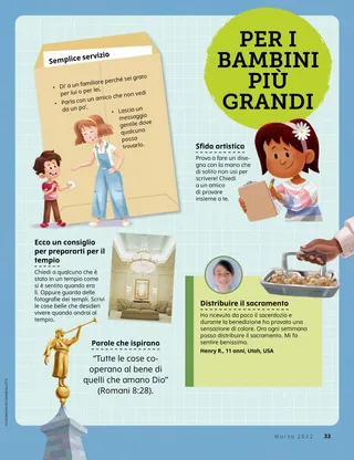 Marzo 2022 Cari amiciLeggi un messaggio su come superare le difficoltà. Amici di postaLeggi alcuni messaggi da parte dei nostri amici da tutto il mondo! Dallin H. OaksSupera le tue difficoltàLeggi un messaggio del presidente Dallin H. Oaks su come superare le tue difficoltà. Juliann DomanTrovare la paceA Molly mancano i suoi fratelli più grandi, ma lo Spirito le dà la pace. Vieni e seguitami Vieni e seguitami – AttivitàUsa queste attività per studiare Vieni e seguitami con la tua famiglia. Giuseppe si prepara per i momenti difficiliLeggi una storia su come Giuseppe si è preparato per i momenti difficili in Egitto. Schede sugli eroi delle ScrittureColleziona le schede per imparare a conoscere i personaggi importanti dell’Antico Testamento! Questo mese: Giuseppe, Scifra e Pua. Fai un cesto per il piccolo Mosè!Fai un cesto come quello in cui Mosè fu messo da sua madre. Dieter F. UchtdorfCome facciamo a sapere che il Padre Celeste ci ama?Leggi un messaggio dell’anziano Dieter F. Uchtdorf sull’amore del Padre Celeste. Haley YanceyLo scherzo delle biciSam e i suoi amici nascondono delle parti delle biciclette di alcuni sconosciuti. Sam si pente e sceglie di non farlo più. Caccia al tesoro familiareScopri di più sulla tua famiglia e aggiungi qualcosa di nuovo nello scrigno del tesoro della tua storia familiare. Trova gli oggetti!Riesci a trovare gli oggetti nascosti in questa immagine? Incontriamo Alice dalle FigiIncontriamo Alice dalle Figi e scopriamo in che modo aiuta gli altri come faceva Gesù. Gesù si prendeva cura dei malatiLeggi una storia di come Gesù si prendeva cura dei malati e poi prepara un piano per poter aiutare come faceva Lui. Ciao dalle Figi!Scopri le Figi con Margo e Paolo! Marianne von BrachtI supereroi del chioscoDue ragazzi trovano alcune barrette di cioccolato che erano state rubate e decidono di restituirle. È ora di divertirsi con la Conferenza generale!Svolgi queste attività durante la Conferenza generale! Jan PinboroughHe Is ThereImpara a suonare un nuovo inno: “He Is There”. Seguire Gesù insiemeUna raccolta di citazioni di bambini da tutto il mondo. Noelle BarrusSuggerimenti per la tecnologiaSegui questi suggerimenti per usare la tecnologia per scopi buoni. Unisci e coloraUnisci i puntini per completare l’immagine. Matt e MandyMatt parla di onestà con un amico. Per i bambini più grandi Per i bambini più grandiSuggerimenti e sfide per i bambini più grandi. Lucy Stevenson EwellIl pianoforte di LudovicLudovic impara a suonare il pianoforte per il suo piccolo ramo in Togo. Disegnalo!Impara a disegnare da solo un calciatore! Grant S.Paura da palcoscenicoGrant S. racconta di come ha pregato per ricevere conforto prima di una serata dei talenti. Daniella SubietaTorta e gentilezzaJuli impara ad andare d’accordo con sua zia facendo una torta insieme a lei. Che ne pensi?Suggerimenti per aiutare i bambini ad andare d’accordo con i fratelli e le sorelle. Per i piccoli amici Per i piccoli amiciConta le ruote nell’immagine. Ciao, amici!Incontriamo alcuni piccoli amici da tutto il mondo. AttivitàRiesci a trovare gli oggetti nell’immagine? Cose belle da condividereYuki condivide le sue bacchette preferite con sua sorella. Jenny HarrisSbaglio con i pastelliLucy rimedia al suo sbaglio dopo aver disegnato su una sedia. Il Padre Celeste mi aiuterà a superare i momenti difficiliInsegna ai più piccoli usando una pagina da colorare incentrata sul Vangelo. Il messaggio di questo mese è: “Il Padre Celeste mi aiuterà a superare i momenti difficili”. Gesù ha dettoUn poster con il messaggio “Gesù ha detto che mi aiuterà”. Cari genitoriLeggete un messaggio per i genitori su come rafforzare i rapporti familiari.