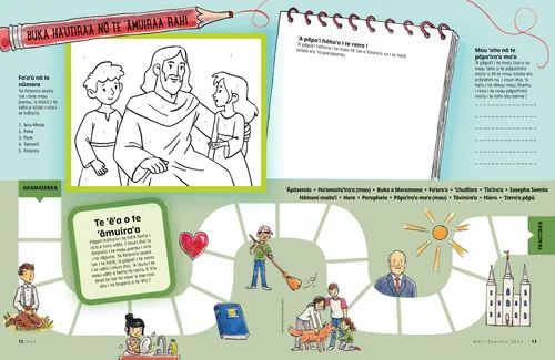 Māti/’Ēperēra 2022 E te mau hoa’A tai’o i te hō’ē parau poro’i nō ni’a i te upo’oti’ara’a i ni’a i te mau fifi. Mau hoa nā roto i te ratauira’A tai’o i te tahi mau ratauira nā tō mātou mau hoa nā te ao ato’a nei ! Dallin H. OaksTe upo’oti’ara’a i ni’a i tō ’outou mau tāmatara’a’A tai’o i te parau poro’i a te peresideni Dallin H. Oaks nō ni’a i te upo’oti’ara’a i ni’a i tō ’outou mau tāmatara’a. Chelsea Flake MortensenTauturura’a ’e te Vārua Maita’i’A fa’aineine ai Mateo nō te bāpetizora’a, ’ua tauturu ’oia ia vetahi ’ē ’e ’ua fāri’i i te Vārua Maita’i. Fārerei ia Alice nō Fītī maiFārerei ia Alice nō Fītī mai ’e e ha’api’i mai e nāhea ’oia i te tauturu mai tā Iesu ra. ’Ua utuutu Iesu i te ta’ata ma’iTai’o i te hō’ē ’ā’amu nō ni’a i tō Iesu utuutura’a i te ta’ata ma’i, ’e i muri iho, ’a rave i te hō’ē fa’anahora’a nō te tauturu, mai tāna i rave. ’Ia ora na nō Fītī mai !Ha’api’i mai nō ni’a te fenua Fītī nā muri ia Margo ’e Paolo ! Haley YanceyTe tōtōāra’a pere’o’o ta’ata’ahiTē huna nei Sam ’e tōna mau hoa i te tahi mau tuha’a o te mau pere’o’o ta’ata’ahi o te mau ta’ata mātau-’ore-hia. ’Ua tātarahapa ’o Sam ’e ’ua mā’iti ’eiaha e nā reira fa’ahou. Buka ha’utira’a nō te ’āmuira’a rahi’A rave i teie mau ’ātivite i roto i te ’āmuira’a rahi. Zoe C.Te mau fā nō te bāpetizora’aTai’o, e mea nāhea tō Zoe C. ha’amaura’a i te mau fā nō te fa’anahora’a a te mau tamari’i ’e a te feiā ’āpī nō te fa’aineine nō tōna bāpetizora’a. ’A ’imi mai !E nehenehe ānei ’oe e ’imi i te mau tao’a i hunahia i roto i te hōho’a ? Mana’o māramaramaE hōho’a pia vāvā nō Iesu Mesia Te pe’e-’āmui-ra’a ia IesuE ’āhuera’a nō te fa’ahitira’a parau a te mau tamari’i ’ati a’e i te ao nei. Benjamin M. Z. TaiTe tātarahapara’a nō te piha hīvira’a ta’ataTai’o i te poro’i a Elder Tai nō ni’a i te tātarahapara’a. Te piriapu o te ta’ata i pīha’i iho maiFa’a’ohipa i te mau tāpa’o nō te tauturu ia Mei ’ia hōro’a i te monamona i te mau ta’ata i pīha’i mai iāna. Lucy Stevenson EwellTe piāna ’a Ludovic’Ua ha’api’i Ludovic i te ha’uti i te piāna nō tāna ’āma’a na’ina’i i Togo. Juliann DomanTe ’itera’a i te hauTē mihi nei Molly i tōna mau tua’ana, ’ua ’itehia rā iāna te hau mai roto mai i te Vārua. Tē fa’aineine nei Iosepha nō te mau tau fifi’A tai’o i te hō’ē ’ā’amu nō ni’a i te huru o tō Iosepha fa’aineinera’a nō te mau tau fifi i Aiphiti. E tauturu mai te Metua i te ao ra iā’u i roto i te mau tau fifi’A ha’api’i i tā ’outou mau tamari’i ri’i ma te fa’a’ohipa i te ’api fa’a’ūra’a i ha’atumuhia i ni’a i te ’evanelia. Teie te parau poro’i nō teie ’āva’e, « E tauturu mai te Metua i te ao ra iā’u i roto i te mau tau fifi ». Mose ’e te māna’A tai’o i te hō’ē ’ā’amu nō ni’a i tō te Atua hōro’ara’a mai i te māna nā Mose ’e nā te ’āti ’Īserā’ela. Mau tāreta ’aito o te pāpa’ira’a mo’a’A ha’aputu i te mau tāreta nō te ha’api’i mai nō ni’a i te mau ta’ata faufa’a rahi i roto i te Faufa’a Tahito ! I teie ’āva’e : ’o Noa ’e ’o Rebeka. E te mau metua here ēTai’o i te hō’ē poro’i nō te mau metua nō ni’a i te ha’apūaira’a i te mau aura’a ’utuāfare.