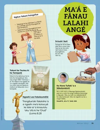 Māʻasi 2022 Si‘i Ngaahi KaungāmeʻaLau ha pōpoaki fekauʻaki mo hono ikunaʻi ʻo e ngaahi faingataʻá. Ngaahi Kaungāmeʻa ʻi he MeilíLau ha meili mei hotau ngaahi kaungāmeʻa he funga māmaní! Dallin H. OaksIkunaʻi Hoʻo Ngaahi FaingataʻaʻiáLau ha pōpoaki meia Palesiteni Tāleni H. ʻOakesi fekauʻaki mo hono ikunaʻi hoʻo ngaahi faingataʻaʻiá. Juliann DomanMaʻu ʻa e NongáʻOku ʻofa ʻa Moli ki hono ngaahi tokoua mo e tuongaʻane lalahí, ka ʻokú ne maʻu ha nonga mei he Laumālié. Haʻu, ʻo Muimui ʻIate Au Ngaahi ʻEkitivitī ʻi heHaʻu, ʻo Muimui ʻIate Aú Fakaʻaongaʻi ʻa e ngaahi ʻekitivitī mo e fakakaukau ko ʻení ke ako ʻa e Haʻu, ʻo Muimui ʻIate Au mo ho fāmilí. ʻOku Teuteu ʻa Siosefa ki he Ngaahi Taimi FaingataʻáLau ha talanoa fekauʻaki mo e teuteu ʻa Siosefa ki he ngaahi taimi faingataʻa ʻi ʻIsipité. Ngaahi Kaati ʻo e Kau Helo ʻi he FolofoláTānaki ha ngaahi kaati ke ako ki he kakai mahuʻinga mei he Fuakava Motuʻá! ʻI he māhina ní: Ko Siosefa mo Sifila mo Piua Faʻu ha Kato maʻá e Pēpē ko Mōsesé!Faʻu ha kato ʻo hangē ko ia naʻe faʻo ai ʻe he faʻē ʻa Mōsesé. Dieter F. UchtdorfʻOku Tau ʻIlo Fēfē ʻOku ʻOfa ʻa e Tamai Hēvaní ʻIate Kitautolú?Lau ha pōpoaki meia ʻEletā Dieter F. Uchtdorf fekauʻaki mo e ʻofa ʻa e Tamai Hēvaní. Haley YanceyKo e Vaʻinga Pauʻu he PasikaláʻOku fūfuuʻi ʻe Samu mo hono ngaahi kaungāmeʻá ha ngaahi kongokonga ʻo e pasikala ʻa ha kau sola ʻe niʻihi. ʻOku fakatomala ʻa Samu pea fakapapau ke ʻoua te ne toe fai ia. Kumi Koloa Fufū FakafāmilíAko fekauʻaki mo ho fāmilí pea tānaki atu ha meʻa foʻou ki hoʻo puha koloa ʻo e hisitōlia fakafāmilí. Kumi Ia!Te ke lava nai ʻo ʻilo e ngaahi meʻa ʻoku fufū ʻi he fakatātaá? Feʻiloaki mo ʻĀlisi mei FisíFeʻiloaki mo ʻĀlisi mei Fisí pea ako ki he founga ʻokú ne tokoni ai ʻo hangē ko Sīsuú. Naʻe Tokangaʻi ʻe Sīsū ʻa e MahakíLau ha talanoa fekauʻaki mo e founga naʻe tokangaʻi ʻaki ʻe Sīsū ʻa e kau mahakí pea fokotuʻu leva ha palani ke tokoni, ʻo hangē ko Iá. Mālō e Lelei mei Fisi!Ako fakataha mo Māko mo Paolo fekauʻaki mo Fisi! Marianne von BrachtKo e Kakai Loto-toʻa ʻi he Tuʻuʻanga Meʻakai Maʻamaʻá Maʻu ʻe ha ongo kiʻi tamaiki tangata ha ngaahi foʻi pā lole naʻe kaihaʻasi pea loto ke fakafoki ia. Fakafiefia ʻo e Konifelenisi Lahí!Fai e ngaahi ʻekitivitī ko ʻení lolotonga e konifelenisi lahí. Jan PinboroughʻOkú Ne ʻI aiAko ke tā ha foʻi hiva foʻou, “ʻOkú Ne ʻI ai.” Muimui Fakataha ʻia SīsūKo hano fakatahatahaʻi ʻo e ngaahi lea ʻa e fānaú mei he funga ʻo e māmaní. Noeli PālosiNgaahi Tokoni FakatekinolosiáMuimui ki he ngaahi tokoni ko ʻení ke fakaʻaongaʻi lelei e tekinolosiá. Fakafehokotaki mo ValivaliFakafehokotaki e ngaahi foʻi totí ke fakaʻosi e laʻi taá. Meti mo Menitī ʻOku akoʻi ʻe Meti ha kaungāmeʻa fekauʻaki mo e faitotonú. Ma‘á e Fānau Lalahi Angé Ma‘á e Fānau Lalahi AngéNgaahi tokoni mo e ngaahi tukupā maʻá e fānau lalahi angé. Lucy Stevenson EwellPiano ʻa LudovicʻOku ako ʻa Ludovic ke tā e pianó maʻa hono kiʻi uōtii fakakolo ʻi Tokó. Tā Ia!Ako ke tā ha fakatātā hoʻo vaʻinga soka! Kalānite S.Ilifia ʻi he Funga SiteisíKo e fakamatala ʻa Kalānite S. ki he founga naʻá ne lotua ai ha fakafiemālie kimuʻa ʻi ha fakaʻaliʻali talēnití. Daniella SubietaKeke mo e AngaʻofaʻOku ako ʻa Suli ke feohi lelei mo hono mehikitangá ʻaki haʻana taʻo keke. Ko e Hā ʻOkú Ke Fakakaukau Ki Aí?Ngaahi tokoni ke tokoniʻi e fānaú ke nau feohi lelei mo honau ngaahi tokouá mo e tuofāfiné. Maʻá e Ngaahi Kaumeʻa Īkí Maʻá e Ngaahi Kaumeʻa ĪkíLau ʻa e ngaahi foʻi vaʻe meʻalele ʻi he fakatātaá. Mālō e Lelei, Ngaahi Kaungāmeʻa!Feʻiloaki mo ha ngaahi kaungāmeʻa kei iiki mei he funga ʻo e māmaní. Ko e Taimi ʻEkitivitií!Te ke lava nai ʻo kumi ʻa e ngaahi meʻa ko ʻení ʻi he fakatātaá? ʻOku Lelei ke VahevaheʻOku vahevahe ʻe ʻIuki ʻa e ongo vaʻakau kai ʻokú ne saiʻia taha aí mo hono tokouá. Seni HālisiKo e Hala ʻa e KaláNaʻe fakaleleiʻi ʻe Lusi ʻene fehalākí hili ia haʻane valivali ha sea. ʻE Tokoniʻi Au ʻe he Tamai Hēvaní ʻi he Ngaahi Taimi FaingataʻáAkoʻi hoʻomou fānau īkí ʻaki ha peesi valivali ʻoku fakatefito ʻi he ongoongoleleí. Ko e pōpoaki ʻo e māhina ní ko e, “ʻE tokoniʻi au ʻe he Tamai Hēvaní ʻi he ngaahi taimi faingataʻá.” Naʻe Folofola ʻa SīsūKo ha pousitā mo e pōpoaki, “Naʻe folofola mai ʻa Sīsū te Ne tokoniʻi au.” Siʻi Ngaahi MātuʻaLau ha pōpoaki maʻá e mātuʻá fekauʻaki mo hono fakamālohia ʻo e ngaahi vā fetuʻutaki fakafāmilí.