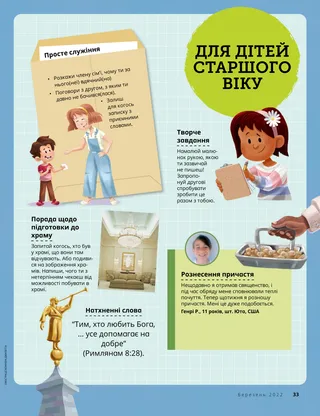 Березень 2022 Дорогі друзі!Прочитайте послання про подолання труднощів. Друзі по листуваннюПрочитай кілька листів від наших друзів з усього світу! Даллін Х. ОуксПодолання ваших труднощівПрочитай послання президента Далліна Х. Оукса про подолання труднощів. Джуліенн ДоменЗнайти спокійМоллі скучає за своїми старшими братами і сестрою, але завдяки Духу знаходить спокій. За Мною йдіть За Мною йдіть: заходиВикористовуйте ці заходи під час вивчення посібника За Мною йдіть разом з сім’єю. Йосип готується до важких часівПрочитай історію про те, як Йосип у Єгипті підготувався до важких часів. Картки “Герої з Писань”Збери картки, щоб дізнатися про видатних людей зі Старого Завіту! Цього місяця: Йосип і Шіфра та Пуа. Зроби кошик для немовляти Мойсея!Зроби кошик, подібний до того, в який Мойсея поклала його мати. Дітер Ф. УхтдорфЗавдяки чому ми знаємо, що Небесний Батько нас любить?Прочитай послання від старійшини Дітера Ф. Ухтдорфа про любов Небесного Батька. Хейлі ЯнсіВелосипедні “жарти”Сем і його друзі ховають ковпачки від ніпелів чужих велосипедів. Сем кається і вирішує більше цього не робити. Пошук сімейних скарбівДізнайся про свою сім’ю і додай щось нове до коробки зі скарбами з сімейної історії. Знайди це на малюнку!Чи можеш ти знайти на малюнку сховані зображення? Будьмо знайомі: Еліс з ФіджіПознайомся з Еліс, яка живе на Фіджі, і дізнайся, як вона допомагає за прикладом Ісуса. Ісус піклувався про хворихПрочитай історію про те, як Ісус піклувався про хворих, а потім склади план, щоб допомагати так, як це робив Він. Привіт з Фіджі!Дізнайся про Фіджі разом з Марго і Паоло! Маріан фон БрахтСупергерої рятують солодощіДва хлопчики знаходять шоколадні батончики, які були викрадені, і вирішують їх повернути. Генеральна конференція: веселі завдання!Виконай ці завдання під час генеральної конференції. Джен ПінбороуHe Is ThereНавчися грати нову пісню: “Він тут є”. Наслідувати Ісуса разомПідбірка дитячих цитат з усього світу. Ноель БаррусПоради щодо технологійСлідуй цим порадам, щоб використовувати технології на користь. З’єднай і розфарбуйЗ’єднай крапки, щоб вийшов малюнок. Метт і МендіМетт навчає друга чесності. Для дітей старшого віку Для дітей старшого вікуПідказки і завдання для дітей старшого віку. Люсі Стівенсон ЮвеллПіаніно ЛюдовикаЛюдовик навчається грати на піаніно для своєї маленької філії у Того. Намалюй це!Навчися малювати, як ти граєш у футбол! Грант С.Страх сцениГрант С. розповідає про те, як він молився про заспокоєння перед шоу талантів. Даніелла Саб’єтаТорт і добротаГотуючи разом торт, Джулі вчиться ладити зі своєю тіткою. Про що ти думаєш?Підказки, щоб допомогти дітям порозумітися зі своїми рідними братами і сестрами. Маленьким друзям Маленьким друзямПорахуй колеса, які бачиш на малюнку. Привіт, друзі!Познайомся з маленькими друзями з усього світу. Час для заходівЧи можеш ти знайти на малюнку ці предмети? Приємно поділитисяЮкі поділився з сестрою своїми улюбленими паличками для їжі. Дженні ГаррісПомилка, зроблена олівцемЛюсі виправляє свою помилку після того, як розмалювала стілець. Небесний Батько допомагатиме мені у важкі часиНавчайте ваших маленьких дітей за допомогою євангельської сторінки-розмальовки. Послання цього місяця: “Небесний Батько допомагатиме мені у важкі часи”. Ісус сказавПлакат з посланням: 
