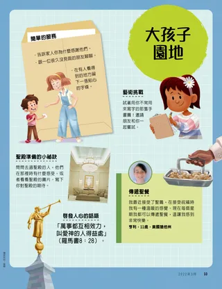2022年3月 親愛的朋友閱讀一則克服挑戰的信息。 朋友天地閱讀來自世界各地朋友的郵件! 達林·鄔克司會長克服挑戰閱讀達林·鄔克司會長有關克服挑戰的信息。 茱莉安·杜曼找到平安莫莉想念她的哥哥姊姊,但她從聖靈那裡找到平安。 來跟從我 來跟從我活動運用這些活動,和家人一起研讀來跟從我。 約瑟為艱困時期作準備閱讀一則約瑟如何為埃及的艱困時期作準備的故事。 經文英雄卡收集卡片來認識舊約中的一些重要人物!這個月:約瑟、施弗拉和普阿。 為嬰孩摩西做一個籃子!做一個籃子,就像摩西的母親用來放他的那個一樣。 迪特·鄔希鐸長老我們怎麼知道天父愛我們?閱讀迪特·鄔希鐸長老有關天父之愛的信息。 海莉·楊希腳踏車惡作劇賽姆和朋友把一些陌生人的腳踏車零件藏起來。賽姆悔改並選擇不再這麼做。 家庭尋寶遊戲認識你的家庭,並在你的家譜藏寶箱中,加入新的收藏。 找找看!你能在圖片中找出隱藏的物件嗎? 認識來自斐濟的方元天地認識來自斐濟的方元天地,了解她如何像耶穌一樣幫助別人。 耶穌照顧病人閱讀耶穌如何照顧病人的故事,然後擬定一個計畫,像祂那樣去幫助人。 來自斐濟的問候!跟瑪歌和保羅一起認識斐濟! 馬莉安·布拉克小吃店超級英雄兩個男孩發現一些被偷的糖果,並決定物歸原主。 總會大會趣味活動!在總會大會時進行這些活動。 詞:珍·賓柏若芙祂在這學習彈奏一首新歌,「He Is There」。 一同跟從耶穌來自世界各地兒童的話語。 諾伊兒·貝魯士科技小祕訣遵循這些小祕訣,使用科技來做好事。 連連看與著色把點連起來,就可完成圖案。 馬太和曼蒂馬太教導朋友要誠實。 大孩子園地 大孩子園地給大孩子的建議和挑戰。 露西·艾維爾盧多維克的鋼琴盧多維克為他在多哥的小分會學彈鋼琴。 畫畫看!學習畫出自己踢足球的樣子! 格蘭特,10歲,美國華盛頓州怯場格蘭特談到他如何在才藝表演前禱告祈求安慰。 丹妮拉·蘇比塔蛋糕與和善藉著和阿姨一起做蛋糕,茱莉學會與她相處。 你在想什麼?幫助子女與兄弟姊妹和睦相處的小祕訣。 幼兒園地 幼兒園地數一數圖片裡的輪子。 朋友,你好!認識世界各地的小朋友們。 活動時間你能在圖片裡找出這些東西嗎? 分享真美好裕貴跟妹妹分享他最喜歡的筷子。 珍妮·哈里斯蠟筆塗鴉的錯誤露西在椅子上塗鴉後,改正了自己的錯誤。 天父會幫助我度過難關用以福音為主的著色頁來教導小小孩。這個月的信息是:「天父會幫助我度過難關。」 耶穌說海報信息:「耶穌說祂必幫助我。」 親愛的父母閱讀給父母的信息,了解如何鞏固家庭關係。