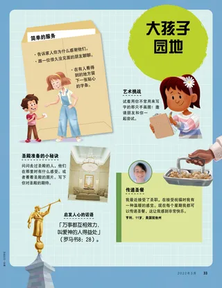 2022年3月 亲爱的朋友阅读一则克服挑战的信息。 朋友天地阅读来自世界各地朋友的邮件! 达林·邬克司会长克服挑战阅读达林·邬克司会长有关克服挑战的信息。 茱莉安·杜曼找到平安莫莉想念她的哥哥姊姊,但她从圣灵那里找到平安。 来跟从我 来跟从我活动运用这些活动,和家人一起研读来跟从我。 约瑟为艰困时期作准备阅读一则约瑟如何为埃及的艰困时期作准备的故事。 经文英雄卡收集卡片来认识旧约中的一些重要人物!这个月:约瑟、施弗拉和普阿。 为婴孩摩西做一个篮子!做一个篮子,就像摩西的母亲用来放他的那个一样。 迪特·邬希铎长老我们怎么知道天父爱我们?阅读迪特·邬希铎长老有关天父之爱的信息。 海莉·杨希脚踏车恶作剧赛姆和朋友把一些陌生人的脚踏车零件藏起来。赛姆悔改并选择不再这么做。 家庭寻宝游戏认识你的家庭,并在你的家谱藏宝箱中,加入新的收藏。 找找看!你能在图片中找出隐藏的物件吗? 认识来自斐济的方元天地认识来自斐济的方元天地,了解她如何像耶稣一样帮助别人。 耶稣照顾病人阅读耶稣如何照顾病人的故事,然后拟定一个计划,像祂那样去帮助人。 来自斐济的问候!跟玛歌和保罗一起认识斐济! 马莉安·布拉克小吃店超级英雄两个男孩发现一些被偷的糖果,并决定物归原主。 总会大会趣味活动!在总会大会时进行这些活动。 词:珍·宾柏若芙祂在这学习弹奏一首新歌,「He Is There」。 一同跟从耶稣来自世界各地儿童的话语。 诺伊儿·贝鲁士科技小秘诀遵循这些小秘诀,使用科技来做好事。 连连看与着色把点连起来,就可完成图案。 马太和曼蒂马太教导朋友要诚实。 大孩子园地 大孩子园地给大孩子的建议和挑战。 露西·艾维尔卢多维克的钢琴卢多维克为他在多哥的小分会学弹钢琴。 画画看!学习画出自己踢足球的样子! 格兰特,10岁,美国华盛顿州怯场格兰特谈到他如何在才艺表演前祷告祈求安慰。 丹妮拉·苏比塔蛋糕与和善藉着和阿姨一起做蛋糕,茱莉学会与她相处。 你在想什么?帮助子女与兄弟姊妹和睦相处的小秘诀。 幼儿园地 幼儿园地数一数图片里的轮子。 朋友,你好!认识世界各地的小朋友们。 活动时间你能在图片里找出这些东西吗? 分享真美好裕贵跟妹妹分享他最喜欢的筷子。 珍妮·哈里斯蜡笔涂鸦的错误露西在椅子上涂鸦后,改正了自己的错误。 天父会帮助我度过难关用以福音为主的着色页来教导小小孩。这个月的信息是:「天父会帮助我度过难关。」 耶稣说海报信息:「耶稣说祂必帮助我。」 亲爱的父母阅读给父母的信息,了解如何巩固家庭关系。