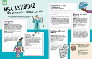 Aktibidad: Gawing napakaespesyal ang Pasko ng Pagkabuhay ngayong taon sa paggawa ng aktibidad na nasa pahina 3. Sa linggo bago sumapit ang Pasko ng Pagkabuhay, magbasa bawat araw tungkol kay Jesus at kulayan ang isang bahagi ng larawan. Maaari mo ring gupitin ang mga larawan sa mga pahina 24–25.