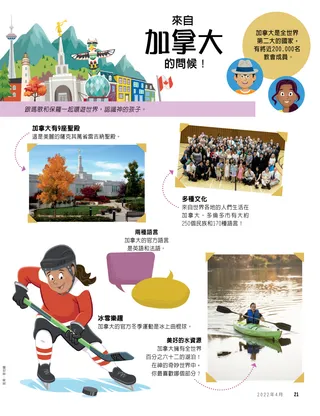 來自加拿大的問候! 跟瑪歌和保羅一起環遊世界,認識神的孩子。 加拿大是全世界第二大的國家,有將近200,000名教會成員。 多種文化 來自世界各地的人們生活在加拿大。多倫多市有大約250個民族和170種語言! 美好的水資源 加拿大擁有全世界百分之六十二的湖泊!在神的奇妙世界中,你最喜歡哪個部分? 冰雪樂趣 加拿大的官方冬季運動是冰上曲棍球。 兩種語言 加拿大的官方語言是英語和法語。 加拿大有9座聖殿 這是美麗的薩克其萬省雷吉納聖殿。 凱蒂·麥地繪