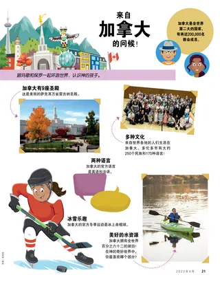 来自加拿大的问候! 跟玛歌和保罗一起环游世界,认识神的孩子。 加拿大是全世界第二大的国家,有将近200,000名教会成员。 多种文化 来自世界各地的人们生活在加拿大。多伦多市有大约250个民族和170种语言! 美好的水资源 加拿大拥有全世界百分之六十二的湖泊!在神的奇妙世界中,你最喜欢哪个部分? 冰雪乐趣 加拿大的官方冬季运动是冰上曲棍球。 两种语言 加拿大的官方语言是英语和法语。 加拿大有9座圣殿 这是美丽的萨克其万省雷吉纳圣殿。 凯蒂·麦地绘