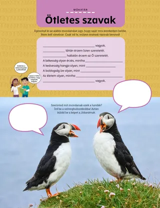2022. április Kedves jóbarátok!Olvass el egy üzenetet a húsvétról. Levelező jóbarátokOlvasd el jóbarátaink leveleit, szerte a világból. Russell M. NelsonJézus feltámadtOlvasd el Russell M. Nelson elnök üzenetét Jézus Krisztusról. Alelie Coronel-Camitan„Mi volt ez az ének?”Amikor Caleb megbetegszik és kórházba kerül, egy elemis éneket énekel, hogy békességet érezzen. Jöjj, kövess engem! tevékenységekHasználjátok ezeket a tevékenységeket a Jöjj, kövess engem! családi tanulmányozásához. Mózes és a mannaOlvass el egy történetet arról, hogyan adott Isten mannát Mózesnek és az izráelitáknak. Szentírások hősei kártyákGyűjtsd a kártyákat, és tanulj az Ószövetség meghatározó személyiségeiről! Ebben a hónapban: Miriám és Mózes Mózes kettéválasztja a Vörös-tengertHasználjátok ezt a szövegkönyvet a történet eljátszásához. Juliann Tenney DomanBátor barátokAmikor az osztálytársai kinevették a barátnőjét, Molly példát mutatott a kedvességre. Családi kincskeresőTanulj a családtörténetedről, és tegyél valami újat a családtörténeti kincsesládikódba. Találd meg!Keresd meg az elrejtett tárgyakat. Ő Tristan, KanadábólIsmerd meg Tristant Kanadából, és tudd meg, hogyan segít úgy, ahogy azt Jézus tette. Jézus imádkozott másokértOlvass el egy történetet arról, hogyan imádkozott Jézus másokért, majd tervezd meg, miként fogsz úgy segíteni, ahogy azt Ő tette. Üdvözlet KanadábólTanulj Kanadáról Margóval és Paolóval Lucy Stevenson EwellFontos szerepKinga nem tud beszélni, de különleges szerepe van az elemis bemutatóban. Húsvét reggelHasználd ezeket a figurákat egy húsvét reggeli jelenet elkészítéséhez. David A. BednarHogyan lehetek áhítatosabb?Olvass el egy üzenetet az áhítatról David A. Bednar eldertől. Áhítatos párosJátsszatok párosító játékot az áhítatról. Együtt követni JézustGyermekektől származó idézetek gyűjteménye szerte a világból. Susan H. PorterValaki szeret tégedOlvass el egy üzenetet Susan H. Porter nővértől Jézus Krisztus szeretetéről. Ötletes szavakEgészítsd ki az alábbi mondatokat úgy, hogy saját vers kerekedjen belőle. Máté és MettiMáté és Metti segítenek a szomszédjuknak és összebarátkoznak vele. Nagyobb gyermekeknekTippek és tevékenységek nagyobb gyermekeknek. Haley YanceyHarriet találkozik a misszionáriusokkalHarriet találkozik a misszionáriusokkal és megtudja, hogy Jézus Krisztusnak köszönhetően örökre együtt lehetnek a családok. Húsvét a világ körülPróbáld ki ezeket a világ különböző tájairól származó húsvéti szokásokat. Christy JepsonSamuel új csapataSamuel azon aggódik, hogy az új csapattagjai nem fogják elfogadni, azonban új barátot szerez. Sierra F.Menj, ülj mellé!Sierra F. elmeséli, hogyan karolt fel egy fiút az iskolában, akit szekáltak. Kis barátoknakA kép befejezéséhez kösd össze a pontokat. Sziasztok, jóbarátok!Találkozz néhány kis baráttal szerte a világból. Tevékenykedjünk!Meg tudod találni a kirakós hiányzó darabjait? A húsvét történeteOlvasd el a húsvét történetét Jane McBrideCsak egyet?Zsombor megtudja, miért fontos áhítatosnak lenni az úrvacsora alatt. Mindennap szükségünk van JézusraTanítsd a kisgyermekeidet evangéliumközpontú színezővel! Az e havi üzenet ez: Mindennap szükségünk van Jézusra Jézus mondtaEgy poszter ezzel az üzenettel: Jézus azt mondta, hogy Ő a Szabadítóm. Kedves Szülők!Olvasd el ezt a szülőknek szóló üzenetet arról, hogyan tanítsd meg a gyermekeidnek, miként szeressenek és vonjanak be másokat.
