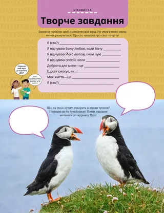 Квітень 2022 Дорогі друзі!Прочитайте послання про Великдень. Друзі по листуваннюПрочитай кілька листів від наших друзів з усього світу! Рассел М. НельсонІсус воскресПрочитай послання від Президента Рассела М. Нельсона про Ісуса Христа. Алелі Коронел-Камітан“Що це за пісня?”Коли Калеб захворів і потрапив до лікарні, то щоб відчути спокій, він співав пісню Початкового товариства. За Мною йдіть: заходиВикористовуйте ці заходи під час навчання за посібником За Мною йдіть разом з сім’єю. Мойсей і маннаПрочитай історію про те, як Бог послав манну Мойсею та ізраїльтянам. Картки “Герої з Писань”Збери картки, щоб дізнатися про видатних людей зі Старого Завіту! Цього місяця: Маріям і Мойсей. Мойсей розділяє води Червоного моряРозіграйте цю історію за сценарієм. Джуліенн Тенні ДоманСміливі подругиКоли однокласники сміються з її подруги, Моллі подає приклад доброти. Пошук сімейних скарбівДізнайся більше про свою сім’ю і додай щось нове до коробки зі скарбами з сімейної історії. Знайди це на малюнку!Знайди сховані предмети. Будьмо знайомі: Трістан з КанадиПознайомся з Трістаном з Канади і дізнайся, як він допомагає іншим так, як це робив би Ісус. Ісус молився за іншихПрочитай історію про те, як Ісус молився за інших, а потім склади план, щоб допомагати так, як це робив Він. Привіт з КанадиДізнайся про Канаду з Марго і Паоло! Люсі Стівенсон ЮвеллОсобливий виступКапрі не може говорити, але вона має особливий виступ у програмі Початкового товариства. Великодній ранокСкористайся цими фігурками, щоб зобразити сценку великоднього ранку. Девід А. БеднарЯк стати більш благоговійними?Прочитай послання старійшини Девіда А. Беднара про благоговіння. Благоговіння: гра “Знайди пару”Зіграй у гру “Знайди пару” на тему: благоговіння. Наслідувати Ісуса разомПідбірка дитячих висловів з усього світу. Сюзен Х. ПортерВас люблятьПрочитай послання сестри Сюзен Х. Портер про любов Ісуса Христа. Творче завданняЗаповни пробіли, щоб написати свій вірш. Метт і МендіМетт і Менді допомагають своїй сусідці і стають друзями з нею. Для дітей старшого вікуПідказки і завдання для дітей старшого віку. Хейлі ЯнсіГарріет зустрічається з місіонерамиГарріет зустрічається з місіонерами і дізнається, що завдяки Ісусу Христу сім’ї можуть бути разом навіки. Великдень у всьому світіСпробуй втілити ці великодні традиції з усього світу. Крісті ДжепсонНова команда Сем’юелаСем’юел хвилюється, що його товариші по команді не приймуть його, але він знаходить нового друга. Сьєрра Ф.Піди, сядь біля ньогоСьєрра Ф. розповідає про те, як вона допомогла в школі хлопцю, якого цькували. Маленьким друзямЗ’єднай крапки, щоб вийшов малюнок. Привіт, друзі!Познайомся з маленькими друзями з усього світу. Час для завданьЧи можеш ти знайти частинки пазла, яких не вистачає? Великодня історіяПрочитай історію про Великдень. Джейн Мак-БрайдЛише один шматочок?Тодд дізнається, чому важливо бути благоговійним під час причастя. Нам потрібен Ісус щодняНавчайте ваших маленьких дітей за допомогою євангельської сторінки-розмальовки. Послання цього місяця таке: “Нам потрібен Ісус щодня”. Ісус сказавПлакат з посланням: “Ісус сказав, що Він—мій Спаситель”. Шановні батьки!Прочитайте послання батькам про те, як навчати своїх дітей любити і бути дружелюбними.