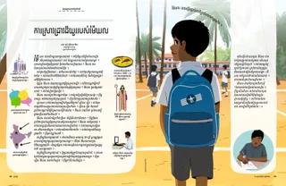 ម៉ៃឃល បានលើកស្ពាយកាបូបរបស់គាត់ ។ ជាថ្ងៃទីមួយដើម្បីទៅសាលារៀន ហើយគាត់សន្ទះសារណាស់ ! គាត់ និងគ្រួសារគាត់រស់នៅប្រទេសឥណ្ឌា ។ កុមារជាច្រើននៅក្នុងទីក្រុងគាត់ ពុំអាចទៅសាលារៀនបានទេ ។ ម៉ៃឃល មានអំណរគុណដែលគាត់មានឱកាសទៅរៀន ។