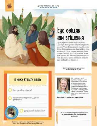 Ісус Христос знав, що після Його смерті Його учням потрібне буде втішення. Тому Він навчав їх про Святого Духа. Він пообіцяв, що Святий Дух буде втішати їх і буде з ними завжди. Одне з імен Святого Духа—Утішитель. Коли нам сумно або ми чогось боїмося, Святий Дух може допомогти нам згадати про любов Ісуса Христа.