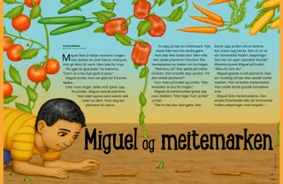Etter noen dager stakk små spirer opp fra jorden. Miguel vannet plantene. Han luket ugress som vokste ved siden av dem. Hver dag ble plantene litt større.