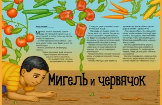 Мигель взрыхлил почву рядом с растениями. Он очень старался не ранить червячка. Он увидел других червей. Глядя, как они роют тоннели, он улыбался.