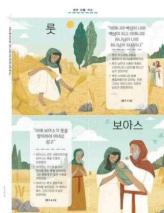 룻은 시어머니와 함께 베들레헴으로 갔어요. 후에 그녀는 보아스라는 의로운 남성과 결혼했어요.