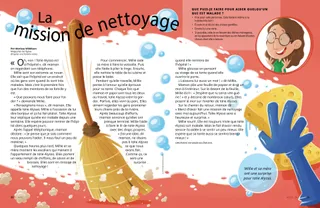 Pour commencer, Millie aide sa mère à faire la vaisselle. Puis elle l’aide à plier le linge. Ensuite, elle nettoie la table de la cuisine et passe le balai.