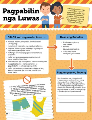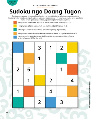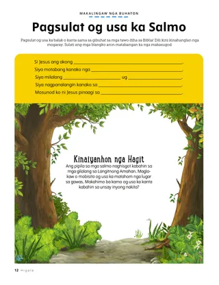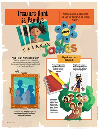 Agosto 2022 Minahal nga mga HigalaBasaha ang usa ka mensahe mahitungod sa pagpanalipod sa inyong kaugalingon ug pagpangayo og tabang. Managhigala pinaagi sa SulatBasaha ang pipila ka sulat gikan sa atong mga higala sa tibuok kalibotan! Russell M. NelsonIpatigbabaw ang Dios Labaw sa Tanan!Basaha ang usa ka mensahe gikan ni Presidente Russell M. Nelson kabahin sa pagpatigbabaw sa Dios labaw sa tanan. Noelle BarrusAndam nga MagbisikletaNaningkamot og maayo si Quade sa pagkat-on unsaon sa pagsakay og bisikleta aron makabisikleta siya uban sa iyang mga higala. Dali, Sunod Kanako nga mga KalihokanGamita kini nga mga kalihokan aron sa pagtuon sa Dali, Sunod Kanako uban sa inyong pamilya. Ang Mga Salmo Nagtudlo Kabahin ni JesukristoPagbasa kabahin sa Mga Salmo diha sa Daang Tugon. Mga Kard sa Bayani sa KasulatanKolektaha ang mga kard aron makat-on mahitungod sa importante nga mga tawo gikan sa Daang Tugon! Niini nga bulan: Si Ruth ug si Boaz. Pagsulat og usa ka SalmoIsulat ang inyong kaugalingong salmo! Maayo nga IdeyaUsa ka poster nga adunay mensahe nga “Kalinaw, hunong.” Julia WillardsonAng Paghinulsol usa ka Maayong Butang!Human nga nasuko si Gemma sa iyang higala, mihukom siya nga maghinulsol ug mangayo og pasaylo. Treasure Hunt sa PamilyaPagkat-on mahitungod sa inyong pamilya ug dugangi og usa ka butang nga bag-o ang inyong kaban sa bahandi sa family history. Pangitaa Kini!Makit-an ba ninyo ang gitago nga mga butang diha sa hulagway? Himamata si Jarom gikan sa MexicoHimamata si Jarom gikan sa Mexico ug pagkat-on kon sa unsang paagi nga siya nagtabang sama ni Jesus. Si Jesus Misaad Kanato og KahupayanBasaha ang usa ka istorya mahitungod kon sa unsang paagi si Jesus misaad kanato og kahupayan ug dayon paghimo og plano sa pagtabang, sama sa Iyang gibuhat. Kumusta gikan sa Mexico!Pagkat-on kabahin sa Mexico uban ni Margo ug Paolo! Marissa WiddisonAng Misyon sa PagpanglimpyoSamtang ang tiya ni Millie anaa sa ospital, si Millie ug si Mama nanglimpyo sa iyang apartment isip sorpresa. Koloranan nga PahinaUsa ka koloranan nga pahina alang sa mga bata Ronald A. RasbandUnsaon Nako nga Makakaplag og Kalinaw atol sa Makahadlok nga mga Panahon?Basaha ang usa ka mensahe gikan ni Elder Ronald A. Rasband mahitungod sa pagkaplag og kalinaw. Tumboka ang mga KalainanPangita og 10 ka kalainan tali sa mga hulagway. Mag-uban sa Pagsunod ni JesusUsa ka koleksiyon sa mga kinutlo sa mga bata gikan sa tibuok kalibotan. Pagpabilin nga LuwasMga ideya sa pagtabang sa mga bata nga makapanalipod sa ilang kaugalingon ug magpabilin nga luwas gikan sa pagpang-abuso Kataw-anan nga mga HayopPangitaa ang kataw-anan nga mga butang nga walay labot sa arka ni Noe. Matt ug MandySi Matt ug Mandy naghisgot mahitungod kon sa unsang paagi ang mga bata makahimo og positibo nga kalainan sa kalibotan. Alang sa Mas Magulang nga mga BataMga sugyot ug mga kalihokan alang sa mas magulang nga mga bata Michele HillNaluwas ni Margaret ang Lisod nga AdlawSa dihang ang barko nagsugod na sa pagkaunlod, nag-ampo si Margaret ug naghunahuna sa paagi sa pagluwas sa lisod nga adlaw. Yulia SalomatinaAng 15 Minutos nga MilagroDili segurado si Sasha ug si Mama nga makaabot sila sa bus sa hustong panahon, apan nag-ampo sila ug gibuhat ang ilang labing maayo. Angeline B.Unsay Makapalipay KanakoSi Angeline B. nga gikan sa Canada naghisgot mahitungod sa mga butang nga makapalipay kaniya. Sudoku nga Daang TugonSulbara ang sudoku nga kalibogan [puzzle] base sa numero diha sa Daang Tugon. Alang sa Gagmay nga mga HigalaSubaya ang mga linya aron mahuman ang mga porma. Kumusta, mga Higala!Himamata ang pipila ka gagmayng mga higala gikan sa tibuok kalibotan. Oras na sa KalihokanMakit-an ba ninyo ang gitago nga mga butang diha sa hulagway? Jennifer MaddyAyaw Panuslok!Si Cait nakat-on nga OK ra nga mohangyo sa iyang higala nga mohunong sa pagpanuslok niya. Jane McBrideSi Miguel ug ang WatiNakakat-on si Miguel kabahin sa usa sa mga gilalang sa Langitnong Amahan. Ang Ginoo Mao Ang Akong MagbalantayTudloi ang inyong gagmay nga mga bata gamit ang koloranan nga pahina nga nakasentro sa ebanghelyo. Ang mensahe niining bulana mao ang, “Ang Ginoo mao ang akong Magbalantay.” Si Jesus MiingonUsa ka poster nga may mensahe, “Si Jesus miingon nga ako kinahanglan nga mopasaylo sa uban.” Minahal nga mga GinikananBasaha ang usa ka mensahe alang sa mga ginikanan kabahin sa pagpanalipod ug pag-amuma alang sa mga bata. Digital Lamang Lori Fuller SosaKasamok Tungod sa PagginitikayManagsuong lalaki ug babaye nakakat-on nga mas morespeto sa usa’g usa ka mga lawas ug sa mga utlanan.