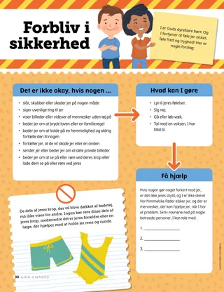 August 2022 Kære vennerLæs et budskab om at beskytte sig selv og få hjælp. PennevennerLæs nogle breve fra vores venner rundt om i verden! Russell M. NelsonLad Gud råde!Læs et budskab fra præsident Russell M. Nelson om at lade Gud råde. Noelle BarrusKlar til at cykleOscar arbejder hårdt på at lære at cykle, så han kan cykle med sine venner. Kom og følg mig AktiviteterBrug disse aktiviteter til at studere Kom og følg mig med jeres familie. Salmerne underviser os om Jesus KristusLæs om Salmernes Bog i Det Gamle Testamente. Kort med skriftens helteSaml på kort, og lær om vigtige personer fra Det Gamle Testamente! Denne måned: Ruth og Boaz. Skriv en salmeSkriv jeres egen salme: En lys idéEn plakat med beskeden »Ti stille, hold inde!« Julia WillardsonOmvendelse er en god ting!Da Emma bliver vred på sin ven, beslutter hun sig for at omvende sig og undskylde. FamilieskattejagtLær noget om jeres familie, og føj noget nyt til jeres slægtshistoriske skattekiste. Find det!Kan I finde de genstande, der er skjult på billedet? Mød Jarom fra MexicoMød Jarom fra Mexico og hør om, hvordan han hjælper, ligesom Jesus gjorde. Jesus lovede at trøste osLæs en historie om, hvordan Jesus lovede at trøste os, og lav derefter en plan for at hjælpe, som han gjorde. Hej fra Mexico!Lær om Mexico med Margo og Paolo! Marissa WiddisonRengøringsmissionenMens Milles moster er på hospitalet, gør Mille og mor hendes lejlighed ren som en overraskelse. MalebogssideEt malebogsside til børn Ronald A. RasbandHvordan kan jeg finde fred i skræmmende tider?Læs et budskab fra ældste Ronald A. Rasband om at finde fred. Find forskellenFind 10 forskelle på billederne. Følger Jesus sammenEn samling af børnecitater fra hele verden. Forbliv i sikkerhedForslag til at hjælpe børn med at beskytte sig og sikre sig mod misbrug. Fjollede dyrFind de fjollede ting, der ikke hører til på Noas ark. Matt og MandyMatt og Mandy taler om, hvordan børn kan gøre en positiv forskel i verden. For større børnTips og aktiviteter for ældre børn. Michele HillMargaret redder situationenDa skibet begynder at synke, beder Margaret og tænker på, hvordan hun kan redde situationen. Yulia Salomatina15 minutter-mirakletSasha og mama er ikke sikre på, at de kan nå bussen i tide, men de beder en bøn og gør deres bedste. Angeline B.Det, der gør mig gladAngeline B. fra Canada fortæller om de ting, der gør hende glad. Det Gamle Testamente – SudokuLøs et sudoku-puslespil baseret på tal i Det Gamle Testamente. For små vennerFølg linjerne for at færdiggøre figurerne. Hej venner!Mød nogle små venner fra hele verden. AktivitetstidKan I finde de genstande, der er skjult på billedet? Jennifer MaddyIngen prikken!Clara finder ud af, at det er okay at bede sin ven om at holde op med at stikke til hende. Jane McBrideMiguel og ormenMiguel lærer om en af vor himmelske Faders skabninger. Herren er min hyrdeUndervis jeres små med en evangelisk malebogsside. Denne måneds budskab er: »Herren er min hyrde.« Jesus sagdeEn plakat med budskabet: »Jesus sagde, at jeg bør tilgive andre.« Kære forældreLæs et budskab til forældre om at beskytte og tage sig af børn. Kun digitalt Lori Fuller SosaKildne problemerEn bror og søster lærer at respektere hinandens krop og grænser bedre.