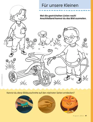 August 2022 Liebe FreundeEine Botschaft, wie man sich schützen und Hilfe holen kann Unsere BrieffreundeLeserpost aus aller Welt! Russell M. NelsonLasst Gott siegenEine Botschaft von Präsident Russell M. Nelson darüber, Gott siegen zu lassen Noelle BarrusStartklarQuade lernt eifrig Fahrrad fahren, damit er seine Freunde begleiten kann. Aktivitäten zu „Komm und folge mir nach!“Aktivitäten für das gemeinsame Studium der Anleitung „Komm und folge mir nach!“ mit der Familie In den Psalmen lernen wir von Jesus ChristusMehr über die Psalmen im Alten Testament Karten zu Heldinnen und Helden aus den SchriftenSammelkarten zu Persönlichkeiten aus dem Alten Testament. Diesen Monat: Rut und Boas. Schreib einen PsalmSchreib einen eigenen Psalm! Ein guter GedankeEin Poster mit der Botschaft: „Schweig, sei still.“ Julia WillardsonUmkehr ist etwas Gutes!Gemma ist auf ihre Freundin wütend, beschließt aber, umzukehren und sich zu entschuldigen. Schatzsuche in der FamilieErfahre mehr über deine Familie und lege etwas Neues in eure Familienschatztruhe. SuchbildFindest du die versteckten Gegenstände? Jarom aus MexikoJarom aus Mexiko hilft so, wie Jesus es getan hat. Jesus verhieß uns TrostEine Begebenheit, wie Jesus uns Trost verheißen hat, und eine Aufforderung, selbst so zu handeln Hallo aus Mexiko!Lerne mit Margo und Paolo Mexiko kennen! Marissa WiddisonAuf PutzmissionAls Millies Tante ins Krankenhaus muss, wollen Millie und Mama sie überraschen und putzen ihre Wohnung. Zum AusmalenEine Ausmalseite für Kinder Ronald A. RasbandWie finde ich Frieden, wenn ich Angst habe?Eine Botschaft von Elder Ronald A. Rasband darüber, wie man Frieden findet Finde die UnterschiedeSuche 10 Unterschiede zwischen den beiden Bildern. Wir folgen Jesus gemeinsamAussagen und Kunstwerke von Kindern aus aller Welt Schütz dich!Anregungen, die Kindern helfen sollen, sich vor Misshandlung und Missbrauch zu schützen Verrückte TiereFinde zehn Gegenstände, die nicht auf die Arche Noachs gehören. Lukas und LeneLukas und Lene sprechen darüber, wie Kinder in der Welt Gutes bewirken können. Für ältere KinderTipps und Aktivitäten für ältere Kinder Michele HillRetterin in der NotAls das Schiff untergeht, betet Margaret und hat eine Idee, wie sie helfen kann. Julia SalomatinaEin Wunder in 15 MinutenSascha und Mama wissen nicht, ob sie den Bus noch rechtzeitig erreichen, aber sie beten und geben ihr Bestes. Angeline B.Das macht mich glücklichAngeline B. aus Kanada erzählt, was sie glücklich macht. Sudoku zum Alten TestamentLöse mithilfe von Zahlen aus dem Alten Testament ein Sudoku! Für unsere KleinenMal die gestrichelten Linien nach! Anschließend kannst du das Bild ausmalen. Hallo, Freunde!Beiträge von kleinen Kindern aus aller Welt SuchbildFindest du die versteckten Gegenstände? Jennifer MaddyNicht anstupsen!Cait lernt, dass sie ihrer Freundin sagen kann, dass sie aufhören soll, sie anzustupsen. Jane McBrideMiguel und der WurmMiguel erfährt mehr über eine Schöpfung des himmlischen Vaters. Der Herr ist mein HirteUnterweisen Sie Ihr kleines Kind mit einem Ausmalbild zum Evangelium. Die Botschaft für diesen Monat: „Der Herr ist mein Hirte.“ Jesus hat gesagtEin Poster mit der Botschaft: „Jesus hat gesagt, dass ich vergeben soll.“ Liebe Eltern!Ein paar Worte an die Eltern über Anregungen, wie man seine Kinder beschützen und auf sie achtgeben kann Nur online Lori Fuller SosaKitzelkabbeleiEin Bruder und eine Schwester lernen, den Körper des anderen zu achten, und verstehen besser, was ihre Grenzen sind.