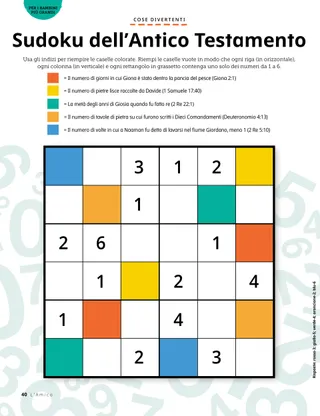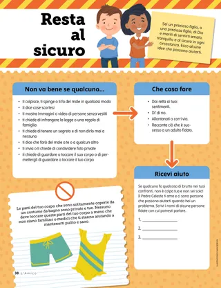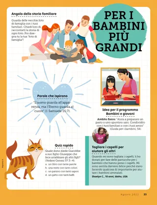 Agosto 2022 Cari amiciLeggi un messaggio su come proteggerti e su come ricevere aiuto. Amici di postaLeggi alcuni messaggi da parte dei nostri amici da tutto il mondo! Russell M. NelsonFai prevalere Dio!Leggi un messaggio del presidente Russell M. Nelson su come far prevalere Dio. Noelle BarrusPronto a partireQuade si impegna molto per imparare ad andare in bicicletta per poter fare un giro con i suoi amici. Vieni e seguitami – AttivitàUsa queste attività per studiare Vieni e seguitami con la tua famiglia. I salmi ci parlano di Gesù CristoScopri di più sui Salmi nell’Antico Testamento. Schede degli eroi delle ScrittureColleziona le schede per imparare a conoscere i personaggi importanti dell’Antico Testamento! Questo mese: Ruth e Boaz. Scrivi un salmoScrivi il tuo salmo personale! Un’idea brillanteUn poster con il messaggio: Stai in pace, calmati. Julia WillardsonIl pentimento è una cosa buona!Dopo essersi arrabbiata con la sua amica, Gemma decide di pentirsi e chiedere scusa. Caccia al tesoro familiareScopri di più sulla tua famiglia e aggiungi qualcosa di nuovo nello scrigno del tesoro della tua storia familiare. Trova gli oggetti!Riesci a trovare gli oggetti nascosti in questa immagine? Incontriamo Jarom dal MessicoIncontriamo Jarom dal Messico e scopriamo in che modo aiuta gli altri come faceva Gesù. Gesù ci ha promesso che saremo confortatiLeggi una storia che parla di come Gesù ha promesso che saremo confortati e poi prepara un piano per poter aiutare come faceva Lui. Ciao dal Messico!Scopri il Messico con Margo e Paolo! Marissa WiddisonLa missione di puliziaMentre la zia di Millie è in ospedale, Millie e la mamma puliscono il suo appartamento per farle una sorpresa. Pagina da colorareDue facciate da colorare per i bambini Ronald A. RasbandCome posso trovare pace nei momenti di paura?Leggi un messaggio dell’anziano Ronald A. Rasband su come trovare pace. Trova le differenzeTrova 10 differenze tra le immagini. Seguire Gesù insiemeUna raccolta di citazioni di bambini da tutto il mondo. Resta al sicuroIdee per aiutare i bambini a proteggersi e a stare al sicuro dai maltrattamenti Animali buffiTrova le cose buffe che non c’entrano con l’arca di Noè. Matt e MandyMatt e Mandy parlano di come i bambini possono influenzare positivamente il mondo. Per i bambini più grandiSuggerimenti e attività per i bambini più grandi Michele HillMargaret salva la situazioneQuando la nave inizia ad affondare, Margaret prega e pensa a un modo per salvare la situazione. Yulia SalomatinaIl miracolo dei 15 minutiSasha e la mamma non sono sicuri di raggiungere la fermata dell’autobus in tempo, ma offrono una preghiera e fanno del loro meglio. Angeline B.Ciò che mi rende feliceAngeline B. dal Canada racconta quali sono le cose che la rendono felice. Sudoku dell’Antico TestamentoRisolvi un sudoku basato sui numeri dell’Antico Testamento. Per i piccoli amiciDisegna lungo le linee tratteggiate per completare le figure. Ciao, amici!Incontriamo alcuni piccoli amici da tutto il mondo. AttivitàRiesci a trovare gli oggetti nascosti in questa immagine? Jennifer MaddyNon si punzecchia!Cait impara che va bene chiedere alla sua amica di smettere di punzecchiarla. Jane McBrideMiguel e il vermeMiguel scopre una delle creazioni del Padre Celeste. L’Eterno è il mio PastoreInsegna ai più piccoli usando una pagina da colorare incentrata sul Vangelo. Il messaggio di questo mese è: “L’Eterno è il mio Pastore”. Gesù ha dettoUn poster con il messaggio “Gesù ha detto che devo perdonare gli altri”. Cari genitoriLeggi un messaggio per i genitori su come proteggere i bambini e prendersi cura di loro. Solo digitale Lori Fuller SosaProblemi di solleticoFratello e sorella imparano a rispettare meglio il corpo e i limiti l’uno dell’altra.