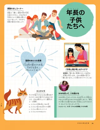 2022年8月号 愛するフレンド(お友達)のみなさん自分を守り,助けてもらうことについてのメッセージを読みましょう。 お友達からのお便り世界各地のお友達からとどいたお便りを読みましょう! ラッセル・M・ネルソン大管長神に勝利を!神に勝利をえていただくことについて,ラッセル・M・ネルソン大管長のメッセージを読みましょう。 ノエル・バラス自転車で出かけるじゅんびクエイドは友達と一緒に出かけられるように,自転車の乗り方を覚えようと一生懸命に努力します。 『わたしにしたがってきなさい』の活動これらの活動を活用して『わたしにしたがってきなさい』を家族で研究しましょう。 詩篇はイエス・キリストについて教えている旧約聖書の詩篇について読みましょう。 聖文ヒーローカードカードを集めて,旧約聖書の重要な人たちについて学びましょう!今月号:ルツとボアズ。 詩篇を書こうあなた自身の詩篇を書きましょう! すばらしいアイデア「静まれ,だまれ」というメッセージが書かれたポスター。 ジュリア・ウィラードソンくい改めは良いことです!友達にはらを立てた後で,ジェマはくい改めてあやまることにしました。 家族のたからさがし家族について学び,家族れきしの宝箱に何か新しいものを加えましょう。 見つけよう!絵の中にかくされたものを見つけられますか? メキシコのハロムをしょうかいしますメキシコのハロムをしょうかいします。ハロムがどのようにしてイエスのように人を助けているか見てみましょう。 イエスはわたしたちになぐさめを約束されましたイエスがどのようにわたしたちになぐさめを約束されたかについての話を読み,イエスのように人を助けるための計画を立てましょう。 メキシコからこんにちは!マルゴとパオロと一緒に,メキシコについて学びましょう! マリッサ・ウィディソンそうじの奉仕ミリーのおばさんが入院している間,ミリーとお母さんはおばさんをおどろかせるためにアパートのそうじをしました。 色をぬりましょう子供のためのぬり絵のページ ロナルド・A・ラズバンド長老こわいときに平安を見いだすには?平安を見つけることについて,ロナルド・A・ラズバンド長老のメッセージを読みましょう。 間違いさがし二つの絵でちがっているところを10こ見つけましょう。 ともにイエスにしたがう世界中から集まった子供たちの言葉や作品。 自分を守る子供たちが自分を守り,虐待から身を守る助けとなるアイデア おかしな動物たちノアの箱舟にのっていないはずの,おかしなものを見つけましょう。 マットとマンディマットとマンディが,子供たちが世界に良いちがいを生み出す方法について話します。 年長の子供たちへ年長の子供たちのためのヒントと活動。 ミッシェル・ヒル危機をすくったマーガレット船がしずみ始めたとき,マーガレットはいのり,危機からのがれる方法を考えます。 ユリア・サロマティーナ15分のきせきサーシャとお母さんは,バスに間に合うかどうか分かりませんが,いのって最善をつくします。 アンジェリン・B,11才(カナダ,ケベック州)わたしを幸せにしてくれるものカナダのアンジェリン・Bが,自分を幸せにしてくれるものについて話します。 旧約聖書で数独パズル旧約聖書に出てくる数字を使って,数独パズルをときましょう。 小さなお友達へ線をなぞって,形を完成させましょう。 やあ,フレンドのみんな!世界各地の小さなフレンドたちをしょうかいします。 活動の時間絵の中にかくされたものを見つけられますか? ジェニファー・マディーつつかないで!ケイトは,友達につつくのをやめるように言っていいことを学びました。 ジェーン・マクブライドミゲルとミミズミゲルが天の御父の創造物の一つについて学びます。 主はわたしの羊飼いです福音を中心としたぬりえを使って小さな子供たちを教えましょう。今月のメッセージは「主はわたしの羊飼いです」です。 イエスは言われました「イエス様は,わたしは人をゆるすべきだと言われました」というメッセージの入ったポスター。 親愛なる親の皆さん子供を守り,世話をすることに関する親へのメッセージをお読みください。 デジタル版のみ ローリー・フラー・ソーサくすぐりからのもめごと兄と妹が,おたがいの体を尊重し,良い距離感を保つことについて学びます。
