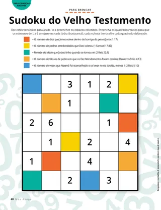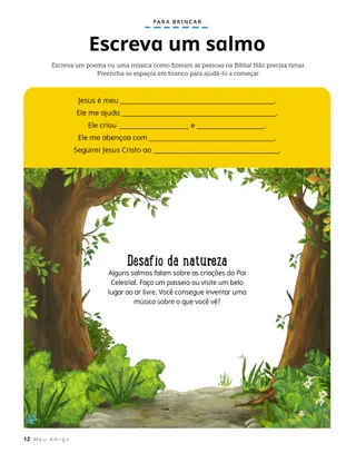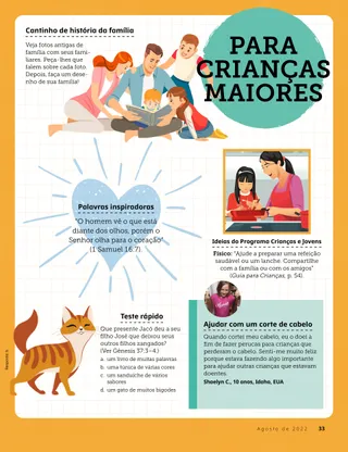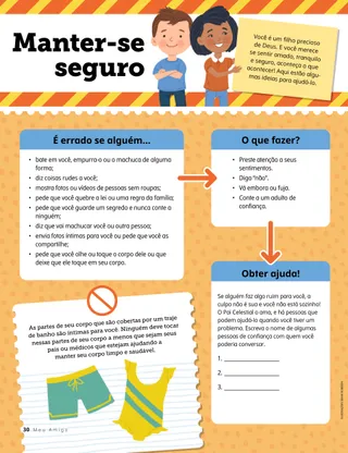 Agosto de 2022 Querido amigoLeia uma mensagem sobre como se proteger e conseguir ajuda. Amigos pelo correioLeia algumas cartas de nossos amigos ao redor do mundo! Russell M. NelsonPermita que Deus prevaleçaLeia uma mensagem do presidente Russell M. Nelson sobre permitir que Deus prevaleça. Noelle BarrusPronto para pedalarQuade se esforça bastante a fim de aprender a andar de bicicleta para poder dar uma volta com seus amigos. Atividades do Vem, e Segue-MeUse estas atividades e ideias para estudar o Vem, e Segue-Me com sua família. Os salmos ensinam sobre Jesus CristoLeia sobre os salmos do Velho Testamento. Cartões de heróis das escriturasColecione os cartões para aprender sobre personagens importantes do Velho Testamento! Este mês: Rute e Boaz. Escreva um salmoEscreva seu próprio salmo! Ideia brilhanteUm cartaz com a mensagem “Cala-te, aquieta-te”. Julia WillardsonO arrependimento é uma coisa boa!Depois que Gemma se aborrece com sua amiga, ela decide se arrepender e pedir desculpas. Caça ao tesouro em famíliaConheça mais sobre sua família e acrescente algo novo em seu baú do tesouro da história da família. Encontre!Você consegue encontrar os objetos escondidos na imagem? Conheça Jarom, do MéxicoConheça Jarom, do México, e saiba como ele ajuda, assim como Jesus. Jesus nos prometeu consoloLeia uma história sobre como Jesus nos prometeu consolo e faça um plano para ajudar, assim como Ele. Saudações do México!Conheça o México, com Margo e Paolo! Marissa WiddisonA missão de limpezaEnquanto a tia de Millie estava no hospital, Millie e sua mãe limparam seu apartamento para lhe fazer uma surpresa. Página para colorirPágina para colorir para as crianças Ronald A. RasbandComo posso encontrar paz em tempos assustadores?Leia uma mensagem do élder Ronald A. Rasband sobre encontrar paz. Encontre as diferençasEncontre 10 diferenças entre as duas figuras. Juntos seguindo a JesusUma coletânea de citações feitas por crianças de todo o mundo. Manter-se seguroIdeias para ajudar as crianças a se protegerem e a se manterem seguras contra o abuso Animais divertidosEncontre as coisas divertidas que não pertencem à arca de Noé. Matt e MandyMatt e Mandy falam sobre como as crianças podem fazer uma diferença positiva no mundo. Para crianças maioresDicas e atividades para as crianças maiores Michele HillMargaret salva o diaQuando o navio começa a afundar, Margaret ora e pensa em uma maneira de salvar o dia. Yulia SalomatinaO milagre de 15 minutosSasha e sua mãe não têm certeza se conseguirão pegar o ônibus a tempo, mas eles fazem uma oração e dão o melhor de si. Angeline B.O que me faz felizAngeline B., do Canadá, conta sobre as coisas que a fazem feliz. Sudoku do Velho TestamentoResolva um quebra-cabeça de sudoku com base nos números do Velho Testamento. Para os amiguinhosTrace linhas para terminar os formatos. Oi, amigos!Conheça alguns amiguinhos ao redor do mundo. AtividadesVocê consegue encontrar os objetos escondidos na imagem? Jennifer MaddySem cutucar!Kate sabe que não há problema em pedir a sua amiga que pare de cutucá-la. Jane McBrideMiguel e a minhocaMiguel aprende sobre uma das criações do Pai Celestial. O Senhor é o meu pastorEnsine seus filhos pequenos utilizando uma página para colorir cujo tema seja o evangelho. A mensagem deste mês é: “O Senhor é o meu pastor”. Jesus disseUm pôster com a mensagem: “Jesus disse que devo perdoar as pessoas”. Prezados paisLeia uma mensagem para os pais sobre proteger os filhos e cuidar deles. Apenas digital Lori Fuller SosaProblema com cócegasUm irmão e uma irmã aprendem a respeitar melhor o corpo e os limites um do outro.