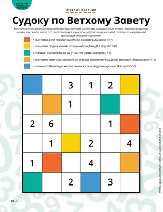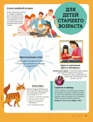 Август 2022 Дорогие друзья!Прочитайте послание о том, как защитить себя и получить помощь. Друзья по перепискеПрочитайте несколько писем от наших друзей по всему миру! Президент Рассел М. НельсонДа восторжествует Бог!Прочитайте послание Президента Рассела М. Нельсона о том, как важно позволить Богу восторжествовать в своей жизни. Ноэль БаррусК поездке готов!Квейд усердно учится ездить на велосипеде, чтобы кататься с друзьями. Задания по учебному плану Приходи, следуй за МноюЭти задания и идеи помогут вам изучать материалы Приходи, следуй за Мною с семьей. Псалмы рассказывают об Иисусе ХристеПрочитайте о псалмах, которые содержатся в Ветхом Завете. Карточки с героями из Священных ПисанийКоллекционируйте карточки, узнавая о значимых людях из Ветхого Завета! В этом месяце: Руфь и Вооз Пишем псаломНапишите свой собственный псалом! Важная мысльПлакат с посланием «Умолкни, перестань». Джулия ВиллардсонПокаяние – это здорово!Джемма сердится на подругу, но потом решает покаяться и извиниться. Поиск семейных сокровищУзнайте о своей семье и добавьте что-нибудь новенькое в свою сокровищницу семейной истории. Найдите!Сможете ли вы найти на картинке спрятанные предметы? Познакомьтесь с Джеромом из МексикиПознакомьтесь с Джеромом из Мексики и узнайте, как он помогает по примеру Иисуса. Иисус обещал нам утешениеПрочитайте историю о том, как Иисус обещал нам утешение, а затем составьте план помогать по Его примеру. Привет из Мексики!Узнайте о Мексике с Марго и Паоло! Марисса УиддисонОперация «Уборка»Пока тетя Милли находится в больнице, Милли с мамой делают ей сюрприз: наводят порядок в ее квартире. РаскраскаБольшая раскраска для детей. Старейшина Рональд А. РасбандКак мне ощутить покой в моменты страха?Прочитайте послание старейшины Рональда А. Расбанда об обретении покоя. Найдите отличияНайдите 10 отличий между рисунками. Следуем за Иисусом вместеКоллекция детских высказываний со всего мира. Ваша безопасностьИдеи о том, как помочь детям защититься и уберечься от насилия Смешные зверушкиНайдите то, чего не могло быть в ковчеге Ноя. Мэтт и МэндиМэтт и Мэнди говорят о том, как дети могут изменить мир к лучшему. Для детей старшего возрастаПолезные советы и задания для детей старшего возраста Мишель ХиллМаргарет спасает всехКогда корабль начинает тонуть, Маргарет молится и придумывает способ всех спасти. Юлия Саломатина15-минутное чудоСаша и мама не знают, успеют ли они на свой автобус, но, помолившись, делают что могут. Анжелина Б., 11 лет, Квебек, КанадаЧто делает меня счастливойАнжелина Б. из Канады рассказывает о том, что делает ее счастливой. Судоку по Ветхому ЗаветуРешите головоломку судоку с числами из книг Ветхого Завета. Для маленьких друзейПроведите пальчиком по пунктирным линиям, чтобы дорисовать формы. Привет, друзья!Познакомьтесь с несколькими маленькими друзьями со всего мира. Время играть!Сможете ли вы найти на картинке спрятанные предметы? Дженнифер МэддиО пальцах и подругахКейт узнаёт, что нет ничего плохого в том, чтобы попросить подругу прекратить тыкать в нее пальцем. Джейн Макбрайд Мигель и червячокМигель узнаёт об одном из творений Небесного Отца. Господь – Пастырь мойОбучите своих малышей при помощи раскраски, сосредоточенной на Евангелии. Послание этого месяца: «Господь – Пастырь мой». Иисус сказалПлакат с п
