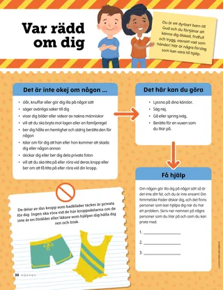 Augusti 2022 Kära vänner!Läs ett budskap om att skydda sig själv och få hjälp. Vänner per postLäs post från våra vänner runt om i världen! Russell M. NelsonLåt Gud råda!Läs ett budskap från president Russell M. Nelson om att låta Gud råda. Noelle BarrusRedo att cyklaQuade arbetar flitigt på att lära sig cykla så att han kan cykla med sina vänner. Aktiviteter för Kom och följ migAnvänd de här aktiviteterna för att studera Kom och följ mig med din familj. Psaltaren undervisar om Jesus KristusLäs om Psaltaren i Gamla testamentet. Kort med hjältar i skrifternaSamla på kort för att lära dig om viktiga personer i Gamla testamentet! Den här månaden: Rut och Boas. Skriv en psalmSkriv en egen psalm! Bra idéEn affisch med budskapet ”Frid, var lugn”. Julia WillardsonOmvändelse är en bra sak!Efter att Gemma blivit arg på sin vän bestämmer hon sig för att omvända sig och be om ursäkt. SläktskattjaktLär dig mer om din släkt och lägg till något nytt i skattkistan för din släktforskning. Hitta dem!Kan du hitta de gömda sakerna i bilden? Möt Jarom från MexikoMöt Jarom från Mexiko och läs om hur han hjälper som Jesus gjorde. Jesus lovade oss tröstLäs en berättelse om hur Jesus lovade oss tröst och gör sedan upp en plan för att hjälpa som han gjorde. Hej från Mexiko!Lär dig mer om Mexiko med Margo och Paolo! Marissa WiddisonStäduppdragetNär Millies moster ligger på sjukhus städar Millie och mamma hennes lägenhet som en överraskning. FärgläggningssidanEn färgläggningssida för barn. Ronald A. RasbandHur kan jag känna frid i skrämmande tider?Läs ett budskap från äldste Ronald A. Rasband om att finna frid. Hitta olikheternaHitta 10 skillnader mellan bilderna. Vi följer Jesus tillsammansEn samling citat från barn runt om i världen. Var rädd om digFörslag för att hjälpa barn skydda sig själva och skydda sig mot övergrepp Lustiga djurHitta de lustiga sakerna som inte hör hemma på Noas ark. Matt och MandyMatt och Mandy pratar om hur barn kan göra en positiv skillnad i världen. För äldre barnTips och aktiviteter för äldre barn Michele HillMargaret räddar dagenNär skeppet börjar sjunka ber Margaret och tänker ut ett sätt att rädda dagen. Yulia Salomatina15-minutersunderverketSasha och mamma är inte säkra på att de kan ta sig till bussen i tid, men de ber en bön och gör sitt bästa. Angeline B.Det som gör mig gladAngeline B. från Kanada berättar om sådant som gör henne glad. Gamla testamentet-sudokuLös ett sudoku baserat på nummer i Gamla testamentet. För små vännerFyll i linjerna för att rita klart formerna. Hej vänner!Möt några små vänner från hela världen. Aktivitetsdags!Kan du hitta de gömda sakerna i bilden? Jennifer MaddyPeta inte!Cait lär sig att det är okej att be sin vän sluta peta på henne. Jane McBrideMiguel och maskenMiguel lär sig om en av vår himmelske Faders skapelser. Herren är min herdeUndervisa era små med en evangeliecentrerad färgläggningssida. Månadens budskap är: ”Herren är min herde.” Jesus saEn affisch med budskapet ”Jesus sa att jag ska förlåta andra”. Kära föräldrar!Läs ett budskap till föräldrar om att skydda och ta hand om barn. Endast digitalt Lori Fuller SosaJobbigt att bli kittladEn bror och syster lär sig att respektera varandras kroppar och gränser bättre.