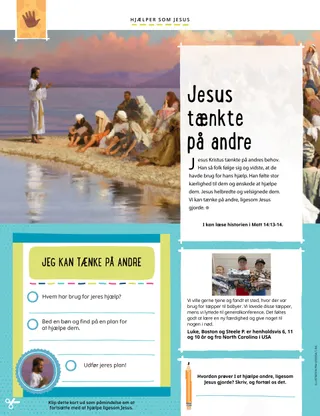 Jesus Kristus tænkte på andres behov. Han så folk følge sig og vidste, at de havde brug for hans hjælp. Han følte stor kærlighed til dem og ønskede at hjælpe dem. Jesus helbredte og velsignede dem. Vi kan tænke på andre, ligesom Jesus gjorde.