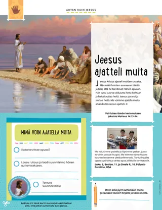Jeesus Kristus ajatteli muiden tarpeita. Hän näki ihmisten seuraavan Häntä ja tiesi, että he tarvitsivat Hänen apuaan. Hän tunsi suurta rakkautta heitä kohtaan ja halusi auttaa heitä. Jeesus paransi ja siunasi heitä. Me voimme ajatella muita aivan kuten Jeesus ajatteli.
