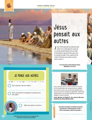 Jésus-Christ pensait aux besoins des autres. Il a vu des gens le suivre et a su qu’ils avaient besoin de son aide. Il ressentait un grand amour pour eux et voulait les aider. Il les a guéris et les a bénis. Pensons aux autres comme Jésus l’a fait.