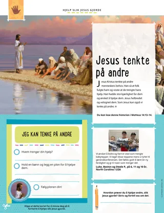 Jesus Kristus tenkte på andre menneskers behov. Han så at folk fulgte ham og visste at de trengte hans hjelp. Han hadde stor kjærlighet for dem og ønsket å hjelpe dem. Jesus helbredet og velsignet dem. Som Jesus kan også vi tenke på andre.