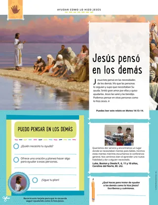 Jesucristo pensó en las necesidades de los demás. Vio que las personas lo seguían y supo que necesitaban Su ayuda. Sintió gran amor por ellas y quiso ayudarlas. Jesús las sanó y las bendijo. Podemos pensar en otras personas como lo hizo Jesús.