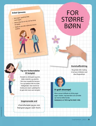 September 2022 Kære vennerLæs et budskab om Jesu Kristi besøg i Amerika i Mormons Bog. PennevennerLæs nogle breve fra vores venner rundt om i verden! Dallin H. OaksDerfor går vi i kirkeLæs et budskab fra præsident Dallin H. Oaks om, hvorfor vi går i kirke. Mary BrenchleyGæt, hvem der holder af dig, fru Banks!Roxy opmuntrer fru Banks ved at lægge blomster på hendes veranda. Kom og følg mig AktiviteterBrug disse aktiviteter til at studere Kom og følg mig med jeres familie. Esajas lærer os om Jesus KristusLæs en historie om, hvordan Esajas talte om Jesus Kristus. Kort med skriftens helteSaml på kort, og lær om vigtige personer fra Det Gamle Testamente. Denne måned: Elias og enken i Sarepta. Hvad passer sammen i skrifterneForbind skriftstederne med profetien om Jesus Kristus. FamilieskattejagtLær noget om jeres familie, og føj noget nyt til jeres slægtshistoriske skattekiste. Haley YanceyLejrvennerEdison møder nogle nye venner på en lejrtur og ønsker at komme tilbage til kirken. KonferenceaktiviteterUdfør disse aktiviteter, mens I lytter til generalkonferencen. Mød Cebisile fra SydafrikaMød Cebisile fra Sydafrika, og lær, hvordan hun hjælper ligesom Jesus. Jesus tænkte på andreLæs en historie om, hvordan Jesus tænkte på andre, og lav derefter en plan for at hjælpe, som han gjorde. Hej fra Sydafrika!Lær om Sydafrika med Margo og Paolo! Julie Cornelius-HuangUkrudt og grimme ordJonas taler med sin mor om et grimt ord, han hørte i skolen. Primarys hovedpræsidentskabBesøg ved optagelserne til Mormons BogLæs et budskab fra Primarys hovedpræsidentskab om de nye videoer om Mormons Bog. Gary E. StevensonHvordan kan jeg vise respekt for andre?Læs et budskab fra ældste Gary E. Stevenson om at respektere andre. Find det!Kan I finde de genstande, der er skjult på billedet? Følger Jesus sammenEn samling af børnecitater fra hele verden. Tami Jeppson Creamer og Derena BellJeg ved, Jesus, han elsker migLær at spille en forenklet version af »Jeg ved, Jesus, han elsker mig«. Matt og MandyMandy tilgiver en pige, der væltede hende omkuld under en fodboldkamp. For større børnTips og aktiviteter for ældre børn. Lucy Stevenson EwellMoisés og pesosMoisés har troen til at betale sin tiende, selv når det er svært. Mål for børn og ungeLav og brug denne terning til at vælge mål til programmet Børn og unge. Jed L.Små ting gør en forskelJed L. fortæller, hvordan han gør en forskel, selvom han er lille. Juliann Tenney DomanForskellige, men ikke aleneDa en dreng driller Megan for at være medlem af Kirken, lærer hun, hvordan man kommer ud af det med andre, selvom man har forskellige overbevisninger. Hvad tænker I på?Her er nogle tips til at bruge venlige ord, selv når andre ikke gør det. For små vennerEn farvelægningsside til små børn Hej venner!Mød nogle små venner fra hele verden. AktivitetstidHvilke bøger passer sammen? Jennifer MaddyJack bruger venlige ordJack taler pænt til andre på biblioteket. Allison WilkinsTid til at synge sammenSarah synger med en ny ven i Primary. Jeg kan lære om Jesus KristusUndervis jeres små med en evangelisk malebogsside. Denne måneds budskab er: »Jeg kan lære om Jesus Kristus.« Jesus sagdeEn plakat med budskabet: »Jesus sagde, at jeg kan bede.« Kære forældreLæs dette budskab til forældre om god sprogbrug.