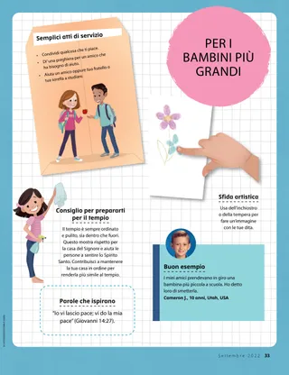 Settembre 2022 Cari amiciLeggi un messaggio sulla visita di Gesù Cristo nelle Americhe riportata nel Libro di Mormon. Amici di postaLeggi alcuni messaggi da parte dei nostri amici da tutto il mondo! Dallin H. OaksPerché andiamo in chiesaLeggi un messaggio del presidente Dallin H. Oaks sul perché andiamo in chiesa. Mary BrenchleyIndovini chi le vuole bene, signora Banks!Roxy rallegra la signora Banks lasciandole dei fiori sul portico. Vieni e seguitami – AttivitàUsa queste attività per studiare Vieni e seguitami con la tua famiglia. Insegnamenti di Isaia su Gesù CristoLeggete una storia sugli insegnamenti dati da Isaia su Gesù Cristo. Schede degli eroi delle ScrittureColleziona le schede per imparare a conoscere i personaggi importanti dell’Antico Testamento! Questo mese: Elia e la vedova di Sarepta. Abbina le ScrittureAbbina i versetti delle Scritture alla profezia su Gesù Cristo. Caccia al tesoro familiareScopri di più sulla tua famiglia e aggiungi qualcosa di nuovo nello scrigno del tesoro della tua storia familiare. Haley YanceyAmici al campeggioEdison incontra alcuni nuovi amici durante un campeggio e vuole tornare in Chiesa. Attività della ConferenzaSvolgi queste attività mentre ascolti la Conferenza generale. Incontriamo Cebisile dal SudafricaIncontriamo Cebisile dal Sud Africa e scopriamo in che modo aiuta gli altri come faceva Gesù. Gesù pensava agli altriLeggi una storia di come Gesù pensava agli altri e poi prepara un piano per aiutare proprio come faceva Lui. Ciao dal Sudafrica!Scopri il Sudafrica con Margo e Paolo! Julie Cornelius-HuangErbacce e parolacceJonas parla alla mamma di una parolaccia che ha sentito a scuola. Presidenza generale della PrimariaVisita al set dei video del Libro di MormonLeggi un messaggio della presidenza generale della Primaria sui nuovi video del Libro di Mormon. Gary E. StevensonCome posso dimostrare rispetto per gli altri?Leggi un messaggio dell’anziano Gary E. Stevenson sul rispettare gli altri. Trova gli oggetti!Riesci a trovare gli oggetti nascosti in questa immagine? Seguire Gesù insiemeUna raccolta di citazioni di bambini da tutto il mondo. Tami Jeppson Creamer e Derena BellIo sento l’amor del SignorImpara a suonare una versione semplificata di “Io sento l’amor del Signor”. Matt e MandyMandy perdona una ragazza che l’ha fatta cadere durante una partita di calcio. Per i bambini più grandiSuggerimenti e attività per i bambini più grandi. Lucy Stevenson EwellMoisés e i pesosMoisés ha fede per pagare la decima anche quando è difficile. Mete per il programma Bambini e giovaniCrea questo cubo per aiutarti a scegliere le mete per il programma Bambini e giovani. Jed L.Le piccole cose fanno la differenzaJed L. parla di come lui fa la differenza anche se è piccolo. Juliann Tenney DomanDiversa ma non da solaQuando un ragazzo prende in giro Megan perché è un membro della Chiesa, lei impara come andare d’accordo anche se credono in cose diverse. Che ne pensi?Ecco alcuni suggerimenti per usare parole gentili anche quando gli altri non lo fanno. Per i piccoli amiciUna pagina da colorare per i bambini piccoli Ciao, amici!Incontriamo alcuni piccoli amici da tutto il mondo. AttivitàTrova i libri uguali! Jennifer MaddyJack usa parole gentiliJack parla con gentilezza agli altri in biblioteca. Grace WilkinsÈ l’ora di cantare insiemeSarah canta con una nuova amica alla Primaria. Posso conoscere Gesù CristoInsegna ai più piccoli usando una pagina da colorare incentrata sul Vangelo. Il messaggio di questo mese è: “Posso conoscere Gesù Cristo”. Gesù ha dettoUn poster con il messaggio “Gesù ha detto che posso pregare”. Cari genitoriLeggete un messaggio per i genitori sull’uso di un linguaggio pulito.
