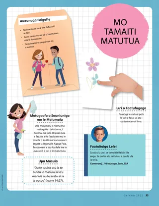 Setema 2022 Uo PelēFaitau se savali e uiga i le asiasiga a Iesu Keriso i Amerika i totonu o le Tusi a Mamona. Uo i le MeliFaitau ni meli mai a tatou uo i le salafa o le lalolagi! Dallin H. OaksAisea Tatou te O Ai i le LotuFaitau se savali mai ia Peresitene Dallin H. Oaks e uiga i le mafuaaga tatou te o ai i le lotu. Mary BrenchleyMate Po o Ai e Alofa ia te Oe, Mrs Banks!Na faafiafia e Roxy ia Mrs Banks e ala i le tuu o fugalaau i luga o lona faapaologa. Gaoioiga o le Sau, Mulimuli Mai Ia Te A’uFaaaoga nei gaoioiga e suesue ai le Sau, Mulimuli Mai ia te A’u ma lou aiga. Ua Aoao mai Isaia e uiga ia Iesu KerisoFaitau se tala e uiga i le auala na aoao atu ai Isaia e uiga ia Iesu Keriso. O Kata o Toa o Tusitusiga PaiaAo mai ni kata e aoao ai e uiga i tagata taua mai le Feagaiga Tuai! O lenei masina: O Elia ma le Fafine Sarefata ua Oti Lana Tane. Faafetaui MauFaafetaui fuaiupu o mau ma le valoaga e uiga ia Iesu Keriso. Sailiga Oa a le AigaAoao e uiga i lou aiga ma faaopoopo se mea fou i lau pusa o oa o talafaasolopito o aiga. Haley YanceyO Uo i le TolauapigaUa feiloai Edison i ni uo fou i se malaga i le tolauapiga ma ua manao e toe foi mai i le lotu. Gaoioiga o le KonafesiFai nei gaoioiga a o e faalogo i le konafesi aoao. Feiloai ia Cebisile mai Aferika i SauteFeiloai ia Cebisile mai Aferika i Saute ma aoao pe o faapefea ona ia fesoasoani e pei o Iesu. Sa Mafaufau Iesu i IsiFaitau se tala e uiga i le mafaufau o Iesu i isi ona fai lea o se fuafuaga e fesoasoani ai, e pei ona Ia faia. Talofa mai Aferika i Saute!Aoao e uiga ia Aferika i Saute ma Margo ma Paolo! Julie Cornelius-HuangO Vao ma Upu LeagaUa talanoa Jonas i lona tina e uiga i se upu leaga sa ia faalogo i ai i le aoga. Au Peresitene Aoao o le PeraimeriAsiasi i le Seti Vitio o le Tusi a MamonaFaitau se savali mai le Au Peresitene Aoao o le Peraimeri e uiga i vitio fou o le Tusi a Mamona. Gary E. StevensonE Faapefea Ona Ou Faaalia le Faaaloalo mo Isi?Faitau se savali mai ia Elder Gary E. Stevenson e uiga i le faaaloalo i isi. Su’e Mai!E mafai ona e sailia mea o loo natia i le ata? Mulimuli Faatasi Ia Iesu O se tuufaatasiga o upusii a tamaiti mai le salafa o le lalolagi. Tami Jeppson Creamer ma Derena BellOu Te Iloa E Alofa Lo’u Faaola Ia Te A’uAoao e ta se lomiga ua faafaigofieina o le “Ua Ou Iloa e Alofa Lo‘u Faaola ia te A’u.” Matt ma MandyUa faamagalo e Mandy se teineitiiti na tuleia o ia i le taimi o se taaloga soka. Mo Tamaiti MatutuaO motugaafa ma gaoioiga mo tamaiti matutua atu. Lucy Stevenson EwellO Moisés ma PesoUa ia Moisés le faatuatua e totogi lana sefuluai e tusa lava pe faigata. Sini mo Tamaiti ma le AutalavouFai le faatafafa lenei e fesoasoani ia te oe e filifili ai sini mo le polokalama a Tamaiti ma le Autalavou. Jed L.O Mea Laiti e Fai ai se EseesegaUa faasoa mai e Jed L. le auala na te faia ai se eseesega e ui ina laitiiti o ia. Juliann Tenney DomanEseese ae le TuuatoatasiIna ua taufaalili se tamaitiiti ia Megan i le avea ai ma se tagata o le Ekalesia, na ia aoaoina le auala e ola ai e ui lava ina eseese o latou talitonuga. O le a Se Mea o i Lou Mafaufau?O nisi nei o fautuaga mo le faaaogaina o upu agalelei e tusa lava pe le faia e isi. Mo Uo LaitiO se itulau valivali mo tamaiti laiti Talofa, Uo!Feiloai atu i nisi o uo laiti mai le salafa o le lalolagi. Taimi o le GaoioigaSue tusi tutusa. Jennifer MaddyE Faaaoga e Jack Upu AgaleleiE tautala atu ma le agalelei Jack i isi i le faletusi. Allison WilkinsTaimi o Pesepesega FaatasiUa pepese Sara ma se uo fou i le Peraimeri. E mafai Ona Ou Aoao e uiga ia Iesu KerisoIa aoao a outou fanau laiti i se itulau valivali e faaogatotonulemu i le talalelei. O le savali o lenei masina o le, “E mafai ona ou aoao e uiga ia Iesu Keriso.” Sa Fetalai mai IesuO se pepa lautele o i ai se savali, “Sa fetalai mai Iesu e mafai ona ou tatalo.” Matua PelēFaitau se savali mo matua e uiga i le faaaogaina o le gagana lelei.