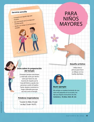 Septiembre de 2022 Queridos amigosLee un mensaje sobre la visita de Jesucristo a las Américas en el Libro de Mormón. Amigos por correo¡Lee algunas cartas de nuestros amigos de todo el mundo! Dallin H. OaksPor qué vamos a la IglesiaLee un mensaje del presidente Dallin H. Oaks sobre por qué vamos a la iglesia. Mary Brenchley.¡Adivine quién la quiere, señora Banks!Roxy anima a la señora Banks dejando flores en la entrada de su casa. Actividades de Ven, síguemeUtiliza estas actividades para estudiar Ven, sígueme con tu familia. Isaías enseña sobre JesucristoLee un relato acerca de cómo Isaías enseñó sobre Jesucristo. Tarjetas de héroes de las Escrituras¡Colecciona las tarjetas para aprender acerca de personas importantes del Antiguo Testamento! Este mes: Elías el Profeta y la viuda de Sarepta. Juego de emparejar EscriturasHaz coincidir los versículos de las Escrituras con la profecía acerca de Jesucristo. Búsqueda del tesoro familiarAprende en cuanto a tu familia y agrega algo nuevo a tu cofre de tesoros de historia familiar. Haley YanceyAmigos del campamentoEdison hace algunos amigos nuevos en un viaje de campamento y desea regresar a la Iglesia. Actividades para la conferenciaHaz estas actividades mientras escuchas la conferencia general. Conoce a Cebisile, de SudáfricaConoce a Cebisile, de Sudáfrica, y descubre el modo en que ella ayuda como lo hizo Jesús. Jesús pensó en los demásLee un relato sobre cómo Jesús pensó en los demás y luego haz un plan para ayudar como lo hizo Él. ¡Hola desde Sudáfrica!¡Aprende acerca de Sudáfrica con Margo y Paolo! Julie Cornelius-HuangHierbas y malas palabrasJonas le habla a su mamá acerca de una mala palabra que escuchó en la escuela. Presidencia General de la PrimariaVisita al lugar de grabación de los videos del Libro de MormónLee un mensaje de la Presidencia General de la Primaria sobre los nuevos videos del Libro de Mormón. Gary E. Stevenson¿Cómo puedo ser respetuoso con los demás?Lee un mensaje del élder Gary E. Stevenson acerca de respetar a los demás. ¡Encuéntralos!¿Puedes encontrar los objetos escondidos en la ilustración? Seguir juntos a JesúsUna recopilación de comentarios de niños de todo el mundo. Tami Jeppson Creamer y Derena BellYo sé que me ama el SalvadorAprende a tocar una versión simplificada de “Yo sé que mi Salvador me ama”. Matt y MandyMandy perdona a una niña que la tiró al suelo durante un partido de fútbol. Para niños mayoresSugerencias y actividades para niños mayores. Lucy Stevenson EwellMoisés y los pesosMoisés tiene fe para pagar el diezmo aun cuando es difícil. Metas de Niños y JóvenesHaz este cubo para ayudarte a elegir metas para el programa Niños y Jóvenes. Jed L.Las cosas pequeñas marcan la diferenciaJed L. comparte cómo marca la diferencia a pesar de ser pequeño. Juliann Tenney DomanDiferente, pero nunca solaCuando un niño se burla de Megan por ser miembro de la Iglesia, ella aprende a llevarse bien con él a pesar de que tienen creencias diferentes. ¿Qué piensas?Aquí tienes algunos consejos para usar palabras amables, aunque otras personas no lo hagan. Para los amigos más pequeñosPágina para colorear para los niños pequeños ¡Hola, amigos!Conoce a algunos amiguitos de la Primaria de todo el mundo. Tiempo para una actividadEncuentra los libros que concuerden. Jennifer MaddyJack usa palabras amablesJack habla con amabilidad a los demás en la biblioteca. Allison WilkinsTiempo para cantar juntosSarah canta con una nueva amiga en la Primaria. Puedo aprender sobre JesucristoEnseñe a sus pequeños con una página para colorear centrada en el Evangelio. El mensaje de este mes es: “Puedo aprender sobre Jesucristo”. Jesús dijoUn póster con el mensaje “Jesús dijo que yo puedo orar”. Estimados padresLean un mensaje para los padres sobre el uso de un buen lenguaje.