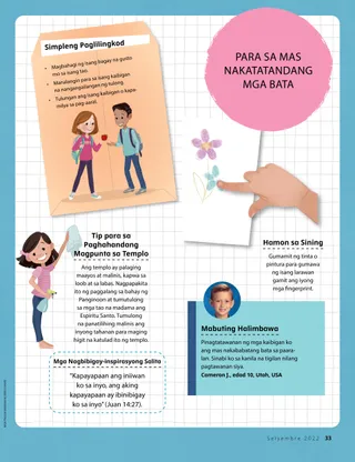 Setyembre 2022 Minamahal na mga KaibiganBasahin ang isang mensahe tungkol sa pagdalaw ni Jesucristo sa mga lupain ng Amerika sa Aklat ni Mormon. Mga Kaibigan sa KoreoBasahin ang ilang sulat mula sa ating mga kaibigan sa iba’t ibang panig ng mundo! Dallin H. OaksBakit Tayo NagsisimbaBasahin ang isang mensahe mula kay Pangulong Dallin H. Oaks tungkol sa kung bakit tayo nagsisimba. Mary BrenchleyHulaan Mo Kung Sino ang Nagmamahal sa Iyo, Gng. Banks!Pinasaya ni Roxy si Gng. Banks sa pamamagitan ng pag-iwan ng mga bulaklak sa balkon nito. Mga Aktibidad para sa Pumarito Ka, Sumunod Ka sa AkinGamitin ang mga aktibidad na ito para pag-aralan ang Pumarito Ka, Sumunod Ka sa Akin kasama ang inyong pamilya. Nagturo si Isaias tungkol kay JesucristoBasahin ang isang kuwento kung paano nagturo si Isaias tungkol kay Jesucristo. Mga Kard tungkol sa mga Bayani sa Banal na KasulatanKolektahin ang mga kard para malaman ang tungkol sa mahahalagang tao mula sa Lumang Tipan! Sa buwang ito: Si Elias at ang Balo ng Zarefta. Pagtutugma ng Mga Banal na KasulatanItugma ang mga talata sa banal na kasulatan sa propesiya tungkol kay Jesucristo. Treasure Hunt ng PamilyaAlamin ang tungkol sa iyong pamilya at magdagdag ng bago sa iyong family history treasure box. Haley YanceyMga Kaibigang NagkakampingNakilala ni Edison ang ilang bagong kaibigan sa isang kamping at gustong bumalik sa simbahan. Mga Aktibidad sa KumperensyaGawin ang mga aktibidad na ito habang nakikinig ka sa pangkalahatang kumperensya. Kilalanin si Cebisile mula sa South AfricaKilalanin si Cebisile mula sa South Africa at alamin kung paano siya tumutulong na katulad ni Jesus. Inisip ni Jesus ang IbaBasahin ang isang kuwento tungkol sa kung paano inisip ni Jesus ang ibang tao at pagkatapos ay magplanong tumulong, tulad ng ginawa Niya. Kumusta mula sa South Africa!Alamin ang tungkol sa South Africa kasama sina Margo at Paolo! Julie Cornelius-HuangMga Damuhan at Masasamang SalitaKinausap ni Jonas ang kanyang ina tungkol sa masamang salitang narinig niya sa paaralan. Primary General PresidencyPagbisita sa Set ng Video ng Aklat ni MormonBasahin ang isang mensahe mula sa Primary General Presidency tungkol sa mga bagong video ng Aklat ni Mormon. Gary E. StevensonPaano Ko Maipapakita ang Paggalang sa Iba?Basahin ang isang mensahe mula kay Elder Gary E. Stevenson tungkol sa paggalang sa iba. Hanapin Ito!Kaya mo bang hanapin ang mga bagay na nakatago sa larawan? Magkakasamang Sumusunod kay JesusIsang koleksyon ng mga sipi mula sa mga bata sa iba’t ibang panig ng mundo. Tami Jeppson Creamer at Derena BellAko ay Minamahal NiyaMatutong tugtugin ang pinasimpleng bersyon ng “Ako ay Mahal ng Aking Tagapagligtas.” Matt at MandyPinatawad ni Mandy ang isang batang babae na bumangga sa kanya habang naglalaro sila ng soccer. Para sa Mas Nakatatandang mga BataMga tip at aktibidad para sa mas nakatatandang mga bata. Lucy Stevenson EwellSi Moisés at ang mga PisoMay pananampalataya si Moisés na magbayad ng kanyang ikapu kahit mahirap ito. Mga Mithiin ng Mga Bata at KabataanGawin ang cube na ito para matulungan kang pumili ng mga mithiin para sa programang Mga Bata at Kabataan. Jed L.Ang Maliliit na Bagay ay Nakagagawa ng KaibhanIbinahagi ni Jed L. kung paano siya nakagagawa ng kaibhan kahit na maliit siya. Juliann Tenney DomanNaiiba pero Hindi Nag-iisaNang tinukso ng isang batang lalaki si Megan sa pagiging miyembro ng Simbahan, natutuhan niya kung paano makisama kahit magkaiba ang kanilang mga paniniwala. Ano ang Iniisip Mo?Narito ang ilang mungkahi sa paggamit ng mabuting pananalita kahit na hindi ito ginagawa ng iba. Para sa Maliliit na KaibiganIsang pahinang kukulayan para sa maliliit na bata Hello, mga Kaibigan!Kilalanin ang ilang maliliit na kaibigan mula sa iba’t ibang panig ng mundo. Oras ng AktibidadHanapin ang magkakatugmang aklat. Jennifer MaddyGumagamit si Jack ng Mabubuting SalitaMagalang na nagsasalita si Jack sa ibang tao sa library. Allison WilkinsOras ng Sama-samang PagkantaKumanta si Sarah kasama ang isang bagong kaibigan sa Primary. Maaari Akong Matuto tungkol kay JesucristoTuruan ang inyong mga musmos gamit ang isang pahinang kukulayan na nakasentro sa ebanghelyo. Ang mensahe sa buwang ito ay, “Maaari akong matuto tungkol kay Jesucristo.” Sinabi ni JesusIsang poster na may mensaheng, “Sinabi ni Jesus na maaari akong manalangin.” Minamahal na mga MagulangBasahin ang mensahe para sa mga magulang tungkol sa paggamit ng mabuting pananalita.