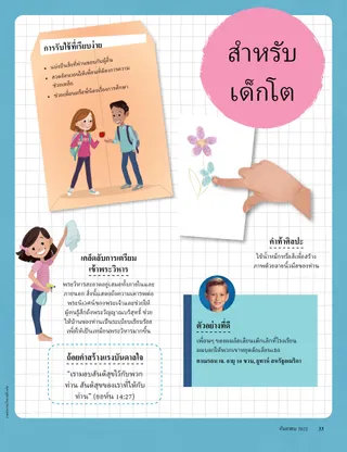 กันยายน 2022 เพื่อนที่รักอ่านข่าวสารเกี่ยวกับการเสด็จเยือนทวีปอเมริกาของพระเยซูคริสต์ในพระคัมภีร์มอรมอน เพื่อนทางจดหมายอ่านจดหมายจากเพื่อนของเราทั่วโลก! ดัลลิน เอช. โอ๊คส์เหตุผลที่เราไปโบสถ์อ่านข่าวสารจากประธานดัลลิน เอช. โอ๊คส์เกี่ยวกับเหตุผลที่เราไปโบสถ์ แมรี่ เบรนช์ลีย์คุณนายแบงค์ ลองนึกดูสิว่าใครรักคุณ!ร็อกซี่ให้กำลังใจคุณนายแบงค์โดยการเอาดอกไม้ไปวางไว้ที่ระเบียงบ้านของเธอ กิจกรรม จงตามเรามาใช้กิจกรรมเหล่านี้ศึกษา จงตามเรามา กับครอบครัวของท่าน อิสยาห์สอนเกี่ยวกับพระเยซูคริสต์อ่านเรื่องราวเกี่ยวกับวิธีที่อิสยาห์สอนเกี่ยวกับพระเยซูคริสต์ การ์ดวีรชนพระคัมภีร์รวบรวมการ์ดเพื่อเรียนรู้เกี่ยวกับบุคคลสำคัญจากพันธสัญญาเดิม! เดือนนี้: เอลียาห์และหญิงม่ายชาวศาเรฟัท จับคู่พระคัมภีร์จับคู่ข้อพระคัมภีร์กับคำพยากรณ์เกี่ยวกับพระเยซูคริสต์ ล่าสมบัติครอบครัวเรียนรู้เกี่ยวกับครอบครัวท่านและเติมสิ่งใหม่ๆ ลงในหีบสมบัติประวัติครอบครัว เฮลีย์ ยันซีย์เพื่อนๆ จากค่ายเอดิสันพบเพื่อนใหม่ในการเดินทางไปค่ายและเขาอยากกลับมาเข้าโบสถ์อีกครั้ง กิจกรรมการประชุมใหญ่ทำกิจกรรมเหล่านี้ขณะที่ท่านฟังการประชุมใหญ่สามัญ พบกับเซบิไซล์จากแอฟริกาใต้พบกับเซบิไซล์จากแอฟริกาใต้และเรียนรู้ว่าเธอช่วยเหลือเหมือนพระเยซูได้อย่างไร พระเยซูทรงนึกถึงผู้อื่นอ่านเรื่องราวเกี่ยวกับวิธีที่พระเยซูทรงนึกถึงผู้อื่น จากนั้นให้วางแผนช่วยเหลือเหมือนที่พระองค์ทรงทำ สวัสดีจากแอฟริกาใต้!เรียนรู้เกี่ยวกับแอฟริกาใต้กับมาร์โกและเปาโล! จูลี คอร์เนเลียส-หวงวัชพืชกับคำพูดที่ไม่ดีโจนาสคุยกับคุณแม่เกี่ยวกับคำพูดแย่ๆ ที่เขาได้ยินที่โรงเรียน ฝ่ายประธานปฐมวัยสามัญเยี่ยมชมสถานที่ถ่ายทำวีดิทัศน์พระคัมภีร์มอรมอนอ่านข่าวสารจากฝ่ายประธานปฐมวัยสามัญเกี่ยวกับวีดิทัศน์พระคัมภีร์มอรมอนเรื่องใหม่ แกรีย์ อี. สตีเวนสันฉันจะแสดงความเคารพต่อผู้อื่นได้อย่างไร?อ่านข่าวสารจากเอ็ลเดอร์แกรีย์ อี. สตีเวนสันเกี่ยวกับการเคารพผู้อื่น หาให้เจอ!ท่านหาสิ่งที่ซ่อนอยู่ในภาพเจอหรือไม่? ร่วมกันติดตามพระเยซูรวมคำพูดจากเด็กๆ ทั่วโลก ทามิ เจพพ์สัน ครีเมอร์ และเดเรนา เบลล์ฉันรู้พระผู้ช่วยทรงรักฉันเรียนรู้วิธีเล่นเพลง “ฉันรู้พระผู้ช่วยทรงรักฉัน” เวอร์ชันง่ายๆ แมทท์กับแมนดีแมนดีให้อภัยเด็กหญิงที่ชนเธอล้มระหว่างการแข่งขันฟุตบอล สำหรับเด็กโตเคล็ดลับและกิจกรรมสำหรับเด็กโต ลูซี สตีเวนสัน อีเวลล์มอยเซสกับเงินเปโซมอยเซสมีศรัทธาท