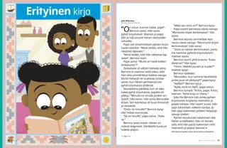 Bernice seurasi sormellaan kannessa olevia sanoja. ”Mormonin kirjan kertomuksia”, hän sanoi.