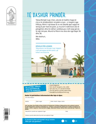 Nëntor 2022 I Dashur MikLexoni një mesazh rreth profetëve. Miqtë me PostëLexo disa mesazhe dërguar me postë nga miqtë tanë anembanë botës! Konferenca Është për Ty Përqendrimi tek Tempulli Njoftimet e Konferencës Shënimet e Konferencës Trego dhe Thuaj për Konferencën Riçard M. RomniTamam në Masën e DuhurTrinën e ngacmojnë ngaqë është e vogël në trup, por klasa e saj e Fillores e ndihmon ta ndiejë se e duan. Eja, Më Ndiq Eja, Më Ndiq VeprimtaritëPërdori këto veprimtari për ta studiuar programin Eja, Më Ndiq me familjen tënde. Të Shpëtuar nga ZjarriShadraku, Meshaku dhe Abed-negoja shpëtohen nga zjarri kur zgjedhin që të vazhdojnë t’i luten Perëndisë. Kartat e Heronjve të Shkrimeve të ShenjtaMblidh karta që të mësosh rreth njerëzve të rëndësishëm nga Dhiata e Vjetër! Këtë muaj: Esteri dhe Jobi. Ide e ShkëlqyerNjë afishe me mesazhin: “Ndiqe profetin; udhën ai di”. Danieli në Gropën e LuanëvePërdori këto kukulla për gishtat për të treguar historinë e Danielit në gropën e luanëve. Xhejn Mek-BrajdiPak Më Shumë NdihmëAleksit i vjen turp të shkojë në terapi për të folurit, por ai mëson se është në rregull që të ketë nevojë për pak më shumë ndihmë. Njihu me Karmenin nga LibaniNjihu me Karmenin nga Libani dhe mëso se si ajo ndihmon ashtu siç ndihmoi Jezusi. Jezusi Tha që ta Duam të Afërmin TonëLexo një histori rreth mënyrës se si Jezusi dha mësim që ta duam të afërmin tonë dhe pastaj bëj një plan për të ndihmuar, ashtu siç ndihmoi Ai. Përshëndetje nga Libani!Mëso rreth Libanit me Margonë dhe Paolon. Dashamirësia në KlasëPërdori këto ide që të përhapësh dashamirësi në shkollë. Kërkim Thesari për FamiljenMëso për familjen tënde dhe shto diçka të re në kutinë tënde të thesarit për historinë familjare. Gjeje!A mund t’i gjesh objektet e fshehura në figurë? Emi Xhejn LevitiVeprimtari me OrigamiToshi organizon një veprimtari për klasën e tij të re të Fillores në Filipine. Gerit W. GongSi Mund ta Ndihmoj Çdo Njeri që të Ndihet i Mirëpritur?Lexo një mesazh nga Plaku Gerit W. Gong lidhur me ndihmën ndaj të tjerëve që të ndihen të mirëpritur. Gjëzë FutbolliPërdori të dhënat kyç për të gjetur emrin e secilit fëmijë. Meti dhe MendiMendi bën një listë të njerëzve për të cilët është më shumë mirënjohëse. Për Fëmijët më të Mëdhenj Për Fëmijët më të MëdhenjKëshilla dhe veprimtari për fëmijët më të mëdhenj. Megan RohasFelipe Gjen UdhënFelipe lutet që të gjejë udhën kur ka humbur dhe Ati Qiellor e udhërrëfen drejt sigurisë. Bëhu Gati për Tempullin!Dëgjo nga fëmijë anembanë botës rreth përgatitjes për të shkuar në tempull. Një Bashkëbisedim me Shiomarën rreth të Qenit e Sapoardhur tek Të RejatNjihu me Shiomarën dhe mëso se si është që të kalosh në organizatën e Të Rejave. Cikja MirënjohëseLuaj këtë lojë zbavitëse me cikje për të kujtuar bekimet e tua. Për Miqtë e Vegjël Për Miqtë e VegjëlMbaroje modelin e notave muzikore. Përshëndetje, Miq!Njihu me disa miq të vegjël nga e gjithë bota. Koha e VeprimtarisëGjej pjesët që mungojnë në figurëformuesen. Xhenifer MediNjë Ndihmues i LumturFeliksi ndihmon që të pastrojë shtëpinë e tij. Xhulia UillardsoniLibri i VeçantëBernisa merr një libër të veçantë të shkrimeve të shenjta për ta lexuar me prindërit e vet. Unë Mund të Bëj Atë që Është e DrejtëJepuni mësim të vegjëlve tuaj me një faqe për ngjyrosje që përqendrohet tek ungjilli. Mesazhi i këtij muaji është: “Unë mund të bëj atë që është e drejtë”. Jezusi ThaNjë afishe me mesazhin: “Jezusi tha se unë duhet të ndjek profetin”. Të Dashur PrindërLexoni një mesazh për prindërit rreth përgatitjes së fëmijëve tuaj për fazat e reja të jetës.