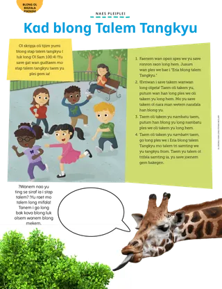 Novemba 2022 Ol Dia FrenRidim wan mesej abaot ol profet. Fren tru long Leta!Ridim sam leta we i kam long ol fren blong yumi raon long wol! Konfrens I Blong Yu Lukluk Nomo long Tempol Ol Nius blong Konfrens Ol Not blong Konfrens Konfrens I Soem mo Talem Richard M. RomneyStret Saes Ia NaoOli jikim Trina from se hem i smol, be Praemeri klas i helpem hem blong filim lav. Kam Folem Mi Ol Aktiviti long Kam Folem MiYusum ol aktiviti ia blong stadi Kam Folem Mi wetem famli blong yu. God i Sevem olgeta long Bigfala FaeaSadrak, Mesak, mo Abednego God i sevem olgeta long bigfala faea ia taem oli jusum blong gohed blong stap prea long Hem. Ol Skripja Hiro Kad!Kolektem ol kad, blong lanem abaot ol impoten pipol insaed long OlTesteman! Long manis ia: Esta mo Job. Gudfala TingtingWan posta wetem mesej ia, “Folem profet; hem i save rod.” Daniel mo Hol Ia blong Ol LaeonYusum ol fingga papet ia blong talem stori blong Daniel mo hol ia blong ol laeon. Jane McBrideWan Smol Ekstra HelpAlex i sem blong go long klas we i blong save toktok gud mo klia, be hem i lanem tu se hem i ORAET blong nidim wan smol ekstra help. Mitim Carmen blong LebanonMitim Carmen blong Lebanon mo lanem olsem wanem hem i help semmak olsem Jisas. Jisas I Talem blong Lavem Ol Neba blong YumiRidim wan stori abaot olsem wanem Jisas i bin tijim yumi blong lavem ol neba blong yumi mo afta mekem plan blong help, semmak olsem we Hem i mekem. !Halo i Kam long Lebanon!!Lanem abaot Lebanon wetem Margo mo Paolo! Fasin blong Stap Kaen Insaed long KlasrumYusum ol tingting ia blong serem fasin blong stap kaen Famli, Faenem TresaLanem abaot famli blong yu mo ademap wan niu samting i go long famli histri tresa bokis. !Faenem!?Yu save faenem ol samting we oli haed insaed long pikja ia? Amie Jane LeavittAktiviti blong Foldem PepaToshi i oganaesem wan aktiviti blong niufala Praemeri klas blong hem long Filipin. Gerrit W. Gong?Olsem Wanem Nao Mi Save Helpem Evriwan Oli Filim Welkam?Ridim wan mesej we i kam long Elda Gerrit W. Gong abaot helpem ol narawan oli filim welkam. Futbol RidelYusum ol tingting blong faenemaot nem blong wanwan pikinini. Matt mo MandyMandy i mekem wan lis blong ol pipol we hem i wantem tumas blong talem tangkyu long olgeta. Blong Ol Bigfala Pikinini Blong Ol Bigfala PikininiTips mo ol aktiviti blong ol pikinini we oli moa olfala. Megan RoxasFelipe I Faenem Rod IaFelipe i prea blong faenem rod ia taem hem i lus mo Papa long Heven i lidim hem i go long sefples. Rere from TempolHarem long ol pikinini raon long wol taem oli stap rere from tempol. Wan Storian wetem Xiomara abaot Hemia We I Niu insaed long Yang WomanMitim Xiomara mo lanem abaot olsem wanem blong muv i go long Yang Woman. Kad blong Talem TangkyuPlei long tag gem ia blong gat wan gudtaem blong save tingbaot ol blesing blong yu! Blong Ol Smol Fren Blong Ol Smol FrenFinisim ol step ia blong ol not blong miusik. !Halo, Ol Fren!Mitim sam smolsmol fren blong yumi raon long wol. Taem blong AktivitiFaenem ol pis blong pasol we oli lus. Jennifer MaddyWan We I Glad blong Stap HelpFelix i helpem mo klinim hom blong hem. Julia WillardsonSpesel Buk IaBernice i tekem wan spesel skripja buk blong ridim wetem papa mo mama blong hem. Mi Save Mekem Wanem We I RaetTijim ol smolwan blong yufala wetem wan kala pej we i lukluk nomo long gospel. Mesej blong manis ia i, “Mi save mekem wanem we i raet.” Jisas I Bin TalemWan posta wetem mesej ia, “Jisas i talem mi mas folem profet.”. Ol Dia Papa mo MamaRidim wan mesej blong papa mo mama abaot stap mekem rere ol pikinini blong yu long niu step blong laef.
