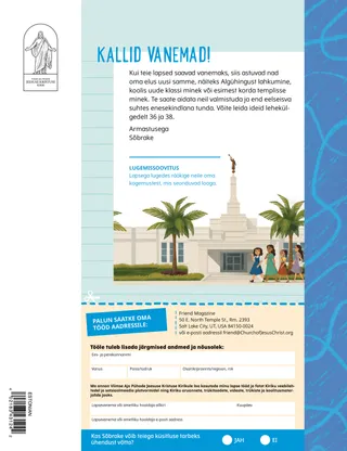 2022. november Kallid sõbrad!Lugege sõnumit prohvetite kohta. Sõbrad posti teelLoe kirju meie sõpradelt üle maailma! Konverents on sulle! Keskenduge templile Konverentsi uudised Konverentsi märkmed Konverentsi „Näita ja räägi” Richard M. RomneyTäpselt õige suurusTrinat noritakse tema väikese kasvu pärast, kuid tema Algühingu klass aitab tal end armastatuna tunda. Tule, järgne mulle „Tule, järgne mulle” tegevusedKasutage neid tegevusi, et uurida koos perega „Tule, järgne mulle” õppetunde. Tule käest päästetudSadrak, Meesak ja Abednego päästetakse tule käest, kui nad otsustavad jätkata Jumala poole palvetamist. Pühakirjakangelaste kaardidKogu kaarte, et õppida olulistest inimestest Vanas Testamendis! See kuu: Ester ja Iiob. Hea mõtePoster sõnumiga, „Prohvetit järgi, teed näitab ta.” Taaniel ja lõukoerte aukKasuta neid näpunukke, et jutustada lugu Taanielist lõukoerte augus. Jane McBrideNatuke lisaabiAlex häbeneb kõneteraapias käimist, kuid siis saab aru, et sellest pole midagi, kui vajame lisaabi. Saa tuttavaks Carmeniga LiibanonistSaa tuttavaks Carmeniga Liibanonist ja saa teada, kuidas tema aitab nagu Jeesus. Jeesus ütles, et armastaksime oma ligimesiLoe lugu sellest, kuidas Jeesus õpetas meid ligimesi armastama, ja tee plaan, kuidas Tema kombel aidata. Tervitused Liibanonist!Õppige Liibanoni kohta koos Margo ja Paologa! Lahkus klassiruumisKasutage neid ideid, et levitada koolis lahkust. Perekonna aardejahtÕpi oma perekonna kohta ja lisa oma pereajaloo aardekirstu midagi uut. Otsi üles!Kas sa leiad üles pildile peidetud asjad? Amie Jane LeavittOrigami tegevusToshi korraldab oma Filipiinidel asuvale uuele Algühingu klassile tegevuse. Gerrit W. GongKuidas saan aidata kõigil end teretulnuna tunda?Loe sõnumit vanem Gerrit W. Gongilt sellest, kuidas aidata teistel end teretulnuna tunda. JalgpallimõistatusKasuta vihjeid, et iga lapse nimi ära arvata. Matt ja MandyMandy koostab nimekirja inimestest, kelle eest ta kõige tänulikum on. Vanematele lastele Vanematele lasteleVihjed ja tegevused vanematele lastele Megan RoxasFelipe leiab teeFelipe palvetab, et leida eksimise järel tee ja Taevane Isa juhatab ta turvalisse kohta. Valmistu templiks!Kuula lastelt üle kogu maailma selle kohta, kuidas templisse minekuks valmistuda. Vestlus Xiomaraga Noortesse Naistesse siirdumisestKohtu Xiomaraga ja saa teada, mida tähendab üleminek Noorte Naiste klassi. Tänulikkuse kullimängMängi seda lõbusat kullimängu, et oma õnnistusi mäletada. Väiksematele sõpradele Väiksematele sõpradeleLõpeta nootide muster. Tere, sõbrad!Kohtu maailma erinevatest nurkadest pärit väikeste sõpradega. Aeg tegevuseksLeia puuduvad pusletükid. Jennifer MaddyRõõmus abilineFelix aitab oma kodu koristada. Julia WillardsonEriline raamatBernice saab erilise pühakirjaraamatu, mida koos oma vanematega lugeda. Ma saan teha häid otsuseidÕpetage oma väikeseid evangeeliumikeskse värvimislehega. Selle kuu sõnum on „Ma saan teha häid otsuseid”. Jeesus ütlesPlakat sõnumiga „Jeesus ütles, et peaksin järgima prohvetit”. Kallid vanemadLugege vanematele mõeldud sõnumit sellest, kuidas valmistada oma lapsi ette uuteks eluetappideks.