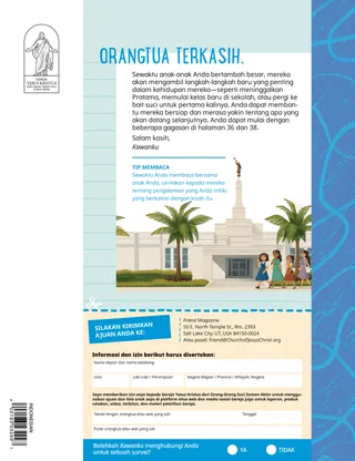 November 2022 Kawan-Kawan TerkasihBacalah sebuah pesan tentang para nabi. Kawan melalui SuratBacalah beberapa surat dari kawan-kawan kita di seluruh dunia! Konferensi Adalah untuk Anda Fokus pada Bait Suci Berita Konferensi Catatan Konferensi Perlihatkan dan Ceritakan Konferensi Richard M. RomneyUkuran yang TepatTrina diejek karena kecil, tetapi kelas Pratamanya membantunya merasa dikasihi. Ikutlah Aku Kegiatan Ikutlah AkuGunakan kegiatan ini untuk menelaah Ikutlah Aku bersama keluarga Anda. Diselamatkan dari ApiSadrakh, Mesakh, dan Abednego diselamatkan dari api ketika mereka memilih untuk terus berdoa kepada Allah. Kartu Pahlawan Tulisan SuciKoleksi kartu untuk belajar tentang orang-orang penting dari Perjanjian Lama! Bulan ini: Ester dan Ayub. Ide CemerlangSebuah poster dengan pesan, “Patuhi nabi; Dia tahu jalannya.” Daniel dan Gua SingaGunakan boneka jari ini untuk menceritakan kisah tentang Daniel dan gua singa. Jane McBrideSedikit Bantuan TambahanAlex malu mengenai pergi ke terapi wicara, tetapi dia belajar bahwa tidak apa-apa untuk memerlukan sedikit bantuan tambahan. Temui Carmen dari LebanonTemui Carmen dari Lebanon dan pelajari bagaimana dia menolong seperti Yesus. Yesus Berfirman agar Mengasihi Sesama KitaBacalah sebuah kisah tentang bagaimana Yesus mengajari kita mengasihi sesama kita dan kemudian buat rencana untuk menolong, seperti yang Dia lakukan. Halo dari Lebanon!Pelajari tentang Lebanon bersama Margo dan Paolo! Kebaikan Hati di Ruang KelasGunakan gagasan-gagasan ini untuk menyebarkan kebaikan hati di sekolah. Berburu Harta Karun KeluargaPelajari tentang keluarga Anda dan tambahkan sesuatu yang baru dalam kotak harta karun sejarah keluarga Anda. Temukanlah!Dapatkah Anda menemukan benda-benda yang tersembunyi dalam gambar? Amie Jane LeavittKegiatan OrigamiToshi mengorganisasi sebuah kegiatan untuk kelas Pratama barunya di Filipina. Gerrit W. GongBagaimana Saya Dapat Membantu Semua Orang Merasa Disambut?Bacalah pesan dari Penatua Gerrit W. Gong mengenai membantu orang lain merasa disambut. Teka-Teki Sepak BolaGunakan petunjuk untuk mencari tahu nama setiap anak. Matt dan MandyMandy membuat daftar tentang orang-orang yang paling dia syukuri. Untuk Anak yang Lebih Besar Untuk Anak yang Lebih BesarTip dan kegiatan untuk anak yang lebih besar. Megan RoxasFelipe Menemukan JalanFelipe berdoa untuk menemukan jalan ketika dia tersesat dan Bapa Surgawi membimbingnya ke tempat yang aman. Bersiap bagi Bait Suci!Dengarkan dari anak-anak di seluruh dunia tentang bersiap untuk pergi ke bait suci. Perbincangan dengan Xiomara tentang Menjadi Baru di Remaja PutriBertemu Xiomara dan belajar tentang seperti apa rasanya bertransisi ke dalam Remaja Putri. Tanda Rasa SyukurMainkan gim tanda yang menyenangkan ini untuk mengingat berkat-berkat Anda! Untuk Kawan Kecil Untuk Kawan KecilSelesaikan pola nada musik. Hai, Kawan!Temui beberapa kawan kecil dari seluruh dunia. Waktu KegiatanTemukan potongan-potongan puzzle yang hilang. Jennifer MaddySeorang Penolong yang BahagiaFelix menolong membersihkan rumahnya. Julia WillardsonBuku IstimewaBernice mendapatkan buku tulisan suci istimewa untuk dibaca bersama orangtuanya. Saya Dapat Melakukan Apa yang BenarAjari anak-anak kecil Anda dengan lembar mewarnai yang berpusat pada Injil. Pesan bulan ini adalah, “Saya dapat melakukan apa yang benar.” Yesus BerfirmanSebuah poster dengan pesan, “Yesus berfirman saya hendaknya mematuhi nabi.” Orangtua TerkasihBacalah pesan untuk orangtua tentang mempersiapkan anak-anak Anda untuk tahap baru kehidupan.