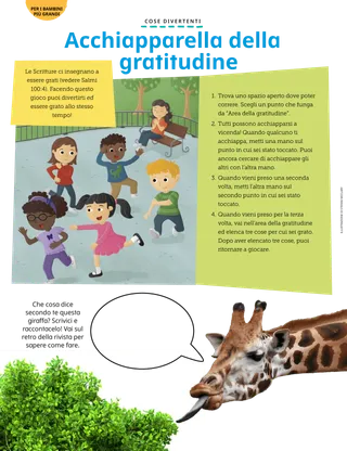 Novembre 2022 Cari amiciLeggi un messaggio sui profeti. Amici di postaLeggi alcuni messaggi dei nostri amici da tutto il mondo! La Conferenza è per te! Concentratevi sul tempio Notizie dalla Conferenza Appunti sulla Conferenza Mostra e racconta la Conferenza Richard M. RomneyLa misura giustaTrina viene presa in giro perché è piccola, ma la sua classe della Primaria la aiuta a sentirsi amata. Vieni e seguitami Vieni e seguitami – AttivitàUsate queste attività per studiare Vieni e seguitami con la tua famiglia. Salvati dal fuocoShadrac, Meshac e Abed-nego vengono salvati dal fuoco quando scelgono di continuare a pregare Dio. Schede degli eroi delle ScrittureColleziona le schede per imparare a conoscere i personaggi importanti dell’Antico Testamento! Questo mese: Ester e Giobbe. Un’idea brillanteUn poster con il messaggio: “Segui il profeta; egli conosce la retta via”. Daniele e la fossa dei leoniUsa questi burattini da dito per raccontare la storia di Daniele e della fossa dei leoni. Jane McBrideUn piccolo aiuto in piùAlex è imbarazzato all’idea di fare logopedia, ma impara che va bene avere bisogno di un piccolo aiuto in più. Incontriamo Carmen dal LibanoIncontriamo Carmen dal Libano e scopriamo in che modo aiuta gli altri come faceva Gesù. Gesù disse di amare il nostro prossimoLeggi la storia di come Gesù ci insegnò ad amare il nostro prossimo e studia un piano per poter aiutare come faceva Lui. Ciao dal Libano!Scopri il Libano con Margo e Paolo! Gentilezza in classeUsa queste idee per diffondere gentilezza a scuola. Caccia al tesoro familiareScopri di più sulla tua famiglia e aggiungi qualcosa di nuovo nello scrigno del tesoro della tua storia familiare. Trova gli oggetti!Riesci a trovare gli oggetti nascosti in questa immagine? Amie Jane LeavittL’attività di origamiToshi organizza un’attività per la sua nuova classe della Primaria nelle Filippine. Gerrit W. GongCome posso aiutare tutti a sentirsi benvenuti?Leggi un messaggio dell’anziano Gerrit W. Gong su come aiutare gli altri a sentirsi benvenuti. L’enigma del calcioUsa gli indizi per capire come si chiama ogni bambino. Matt e MandyMandy fa un elenco delle persone per cui è più grata. Per i bambini più grandi Per i bambini più grandiSuggerimenti e attività per i bambini più grandi. Megan RoxasFelipe trova la stradaDopo essersi perso, Felipe prega per trovare la strada e il Padre Celeste lo guida fino a che arriva in un luogo sicuro. Prepariamoci per andare al tempio!Vediamo come i bambini di varie parti del mondo si preparano per andare al tempio. Due chiacchiere con Xiomara sul passaggio alle Giovani DonneIncontra Xiomara e scopri com’è il passaggio alle Giovani Donne. Acchiapparella della gratitudineDivertiti giocando ad acchiapparella per ricordare le tue benedizioni! Per i piccoli amici Per i piccoli amiciRicalca le note musicali. Ciao, amici!Incontriamo alcuni piccoli amici da tutto il mondo. AttivitàTrova i pezzi mancanti del puzzle. Jennifer MaddyUn aiutante feliceFelix aiuta a ripulire la casa. Julia WillardsonIl libro specialeBernice riceve uno speciale libro di Scritture da leggere con i suoi genitori. Posso fare ciò che è giustoInsegna ai più piccoli usando una pagina da colorare incentrata sul Vangelo. Il messaggio di questo mese è: “Posso fare ciò che è giusto”. Gesù ha dettoUn poster con il messaggio “Gesù ha detto che devo seguire il profeta”. Cari genitoriLeggete un messaggio per i genitori su come preparare i vostri figli per le nuove fasi della vita.