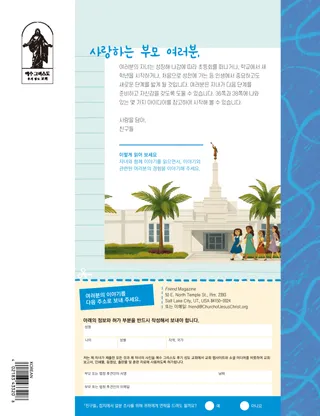 2022년 11월호 사랑하는 친구들에게선지자에 관한 메시지를 읽어 보세요. 편지로 만나는 친구들전 세계 친구들이 보낸 편지를 읽어 보세요! 연차 대회는 여러분을 위한 시간이에요! 선지자가 전한 대회 메시지 대회 소식 대회 노트 우리의 이야기를 들려줄게요 리처드 엠 롬니딱 좋은 키트리나는 키가 작아서 놀림을 받지만, 초등회 반 친구들이 트리나가 사랑받는다고 느끼도록 도와주어요. 와서 나를 따르라 와서 나를 따르라 활동가족과 함께 『와서 나를 따르라』를 공부할 때 아래 활동을 활용해 보세요. 불 속에서 보호되다사드락, 메삭, 아벳느고는 하나님께 계속 기도하기로 결심하자 불 속에서 보호를 받았어요 경전 인물 카드카드를 모으면서 구약전서에 나오는 중요한 인물들을 알아보세요! 이번 달: 에스더와 욥. 빛나는 아이디어“선지자 따라 나아가자. 그는 길을 알고 있으니.”라는 메시지가 담긴 포스터. 다니엘과 사자굴여기 나오는 손가락 인형을 이용해서 다니엘과 사자굴 이야기를 들려주세요. 제인 맥브라이드조금 더 도움이 필요할 때알렉스는 언어 치료를 받는 것이 창피하지만, 도움을 추가로 받는 것도 괜찮다는 것을 알게 되었어요. 레바논에 사는 카르멘을 만나 보세요레바논에 사는 카르멘을 만나 보고, 카르멘이 어떻게 예수님처럼 돕는지 알아보세요. 예수님은 이웃을 사랑하라고 말씀하셨어요예수님께서 어떻게 우리의 이웃을 사랑하라고 가르치셨는지 읽고, 그분처럼 다른 사람을 돕기 위한 계획을 세워 보세요. 안녕하세요? 여기는 레바논이에요!마고, 파올로와 함께 레바논에 대해 배워 보세요! 학교에서 친절한 사람 되기이 아이디어를 활용하여 학교에 친절함을 퍼트리세요. 가족 보물찾기가족에 대해 알아보고 가족 역사 보물 상자에 새로운 것을 추가해 보세요. 숨은그림찾기그림 속에 숨겨진 물건을 찾아보세요. 에이미 제인 리빗종이접기 활동토시는 필리핀에서 새로 참석하는 초등회를 위한 활동을 준비했어요. 게릿 더블유 공모두가 환영받는다는 느낌을 받도록 어떻게 도울 수 있을까요?사람들이 환영받는 느낌을 받도록 돕는 것에 관한 게릿 더블유 공 장로님의 메시지를 읽어 보세요. 축구 수수께끼단서를 보고 아이들의 이름을 알아 내세요. 매트와 맨디맨디는 고마움을 느끼는 사람들의 명단을 만들어요. 고학년 어린이를 위하여 고학년 어린이를 위하여고학년 어린이를 위한 조언과 활동 메건 록사스길을 찾는 펠리페길을 잃은 펠리페가 길을 찾기 위해 기도하자 하나님 아버지께서 그를 안전한 곳으로 안내해 주세요. 성전에 가기 위해 준비해요!성전 준비에 대해 전 세계 어린이들이 들려주는 이야기를 들어보세요. 청녀회로 올라가는 시오마라의 이야기시오마라를 만나 청녀가 되는 것은 어떤 것인지 알아보세요. 감사함을 느낄 수 있는 잡기 놀이재미있는 잡기 놀이를 하면서 여러분이 받은 축복을 기억하세요! 어린 친구들을 위하여 어린 친구들을 위하여규칙을 찾아 악보를 완성하세요. 친구야, 안녕?전 세계의 어린 친구들을 만나보세요. 활동 시간빠진 퍼즐 조각을 찾아보세요. 제니퍼 매디행복한 도우미펠릭스는 집을 청소하는 것을 도와요. 줄리아 윌러드슨특별한 책버니스는 부모님과 함께 읽을 특별한 경전 책을 선물 받았어요. 나는 옳은 일을 할 수 있어요복음을 주제로 한 색칠공부를 통해 어린 자녀를 가르쳐 보세요. 이번 달의 메시지는 “나는 옳은 일을 할 수 있어요”입니다. 예수님이 말씀하셨어요“예수님은 제가 선지자를 따라야 한다고 말씀하셨어요”라는 메시지가 담긴 포스터 사랑하는 부모 여러분자녀가 삶의 새로운 단계를 준비하는 것과 관련하여 부모 여러분에게 전하는 메시지를 읽어 보세요.
